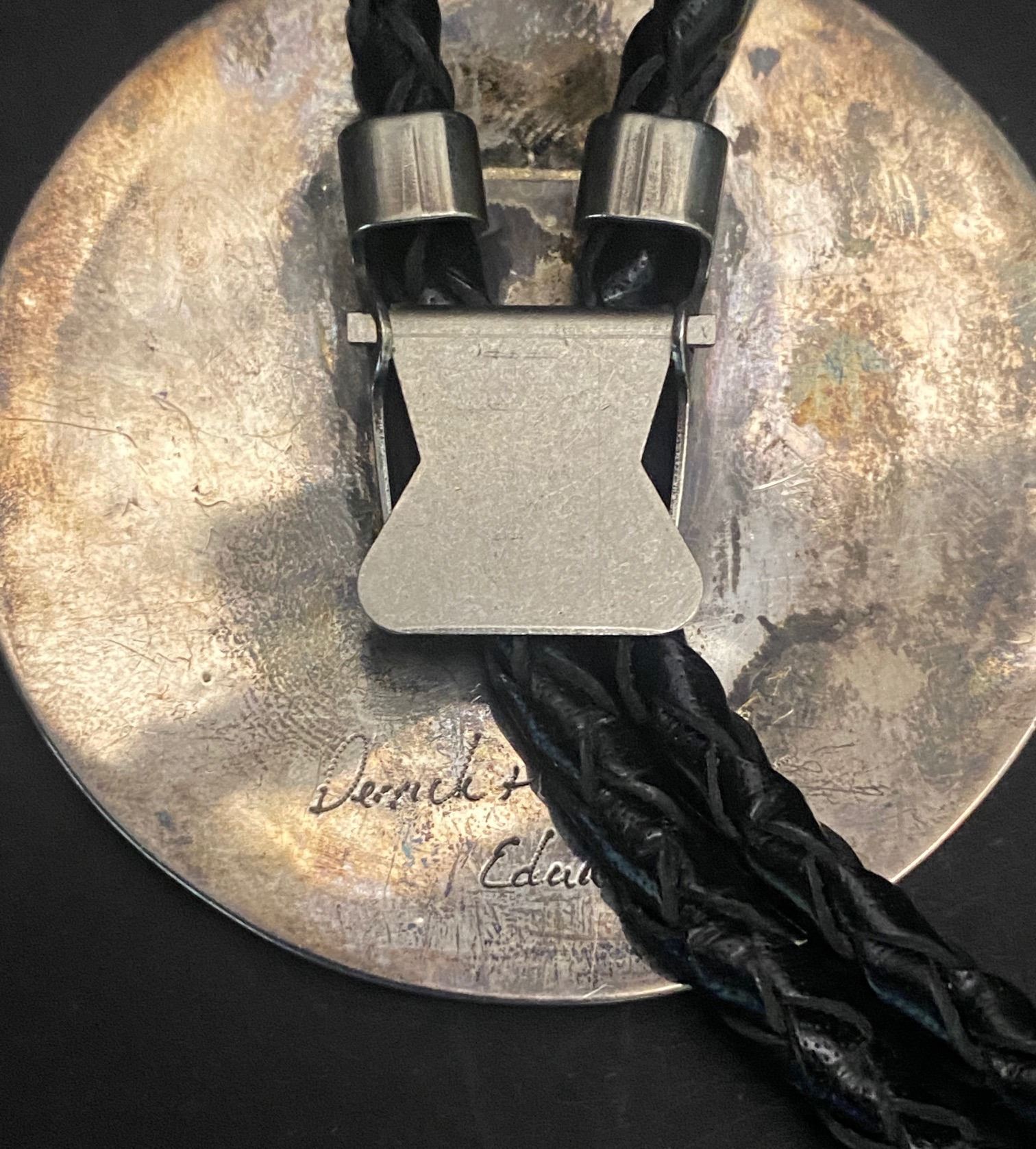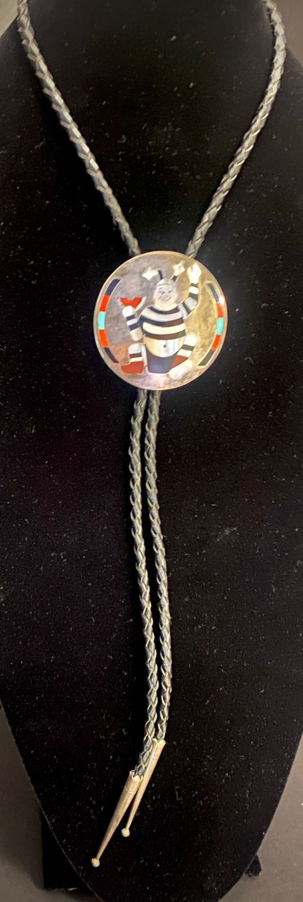 1980's Derrick & Michelle Edaakie Zuni Bolo Koshare with Watermelon. 2 1/4" round X 18 1/2" Neck to tip ends 46 grams Truly a whimsical Bolo how fun is that!