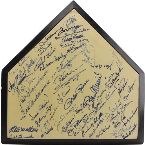 <B>1980's Hall of Famers & Stars Multi-Signed Home Plate.</B></I> Exceptional compilation of sixty 9/10 and better blue sharpie signatures offers all of the names one hopes to find on a piece of this nature: Mantle, DiMaggio, Ted Williams, Mays, Aaron, Mathews, Murray, Killebrew, Schmidt, Frank Robinson, Reggie Jackson, Bench, Morgan, Brett, Berra, Palmer, Fingers, and many, many more. All autographs were acquired in person by our consignor. There's still plenty of room to add more, and any superstar ballplayer will be honored to join this cast of characters. <I>LOA from PSA/DNA. LOA from James Spence Authentication.</B></I><BR><BR><b>Shipping:</b> Miscellaneous Collectibles, Larg (<a target="_blank" href="http://www.heritageauctions.com/common/shipping.php">view shipping information</a>)