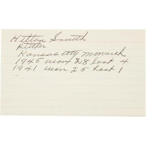 <B>1970's Hilton Smith Signed Index Card.</B></I> Cooperstown's long overdue correction that brought a flood of Negro League talent into the Hall has complicated the lives of many autograph collectors who were forced to seek out the rare autographs from these underappreciated superstars. This lined 3x5" index card will make one such collector's day, as the 10/10 black ink signature is made further appealing by a notation that reads, "Pitcher, Kansas City Monarch, 1945 won 28 lost 4, 1941 won 25 lost 1." The index card is likewise free of flaws. <I>LOA from PSA/DNA. LOA from James Spence Authentication.</B></I><BR><BR><b>Shipping:</b> Flat Material, Small (<a target="_blank" href="http://www.heritageauctions.com/common/shipping.php">view shipping information</a>)