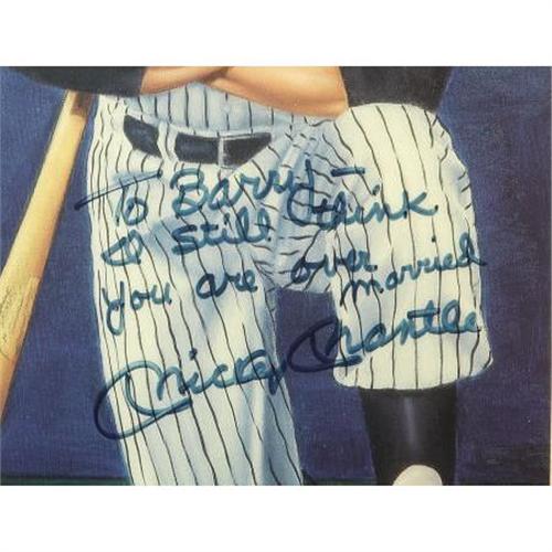 <B>1980's Mickey Mantle Signed Print to Barry Halper.</B></I> The Mick pays tribute to the wife of esteemed late collector Barry Halper upon this unique print pairing a Robert Simon portrait and a lengthy stat sheet recounting the Hall of Famer's storied career. In 10/10 blue sharpie, Mantle writes, "To Barry, I still think you are over-married, Mickey Mantle." A "5/1000" limited edition notation to the right appears to relate to the print itself, which measures 12x20" in size. Complete framed dimensions: 18x25". A unique piece that once held a place of honor in arguably the finest private baseball collection ever assembled. <I>LOA from PSA/DNA. LOA from James Spence Authentication.</B></I><BR><BR><b>Shipping:</b> Framed - with Glass, Medium (<a target="_blank" href="http://www.heritageauctions.com/common/shipping.php">view shipping information</a>)
