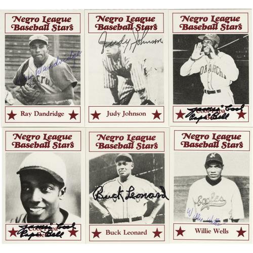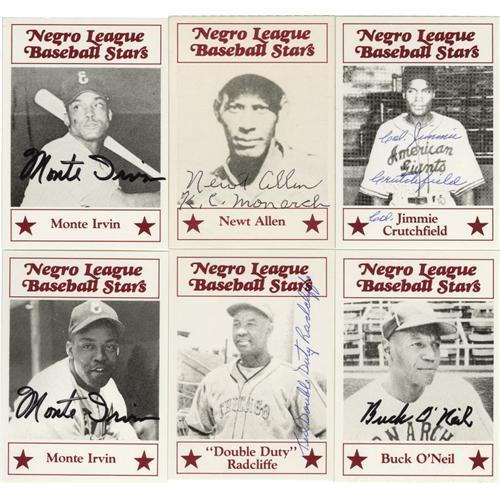 <B>1980's Negro League Stars Signed Trading Cards Lot of 46.</B></I> Highly collectible set was marketed by the great Buck O'Neil in a fund-raising effort for the Negro League Museum in Kansas City. Here we find the complete set of 119 cards, of which forty-six have been autographed by the gentlemen pictured. Highlights include Willie Wells, Judy Johnson, Buck Leonard, James "Cool Papa" Bell, Ray Dandridge, Monte Irvin, Bob Trice, Buck O'Neil, Sam Jethroe, Ted "Double Duty" Radcliffe, Newt Allen and many more. All signatures are rendered in 9/10 or better ink or sharpie, and all cards are in terrific NRMT-MT condition. A splendid set that should only rise in value with the coming years as the surviving ranks of these noble baseball stars will soon dwindle to nothing. <I>LOA from PSA/DNA. LOA from James Spence Authentication.</B></I><BR><BR><b>Shipping:</b> Trading Card Set, Small (<a target="_blank" href="http://www.heritageauctions.com/common/shipping.php">view shipping information</a>)