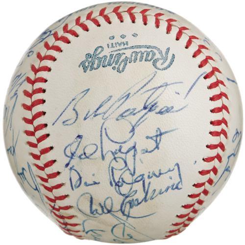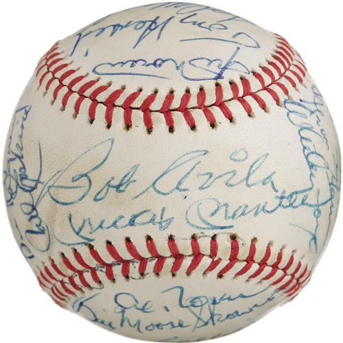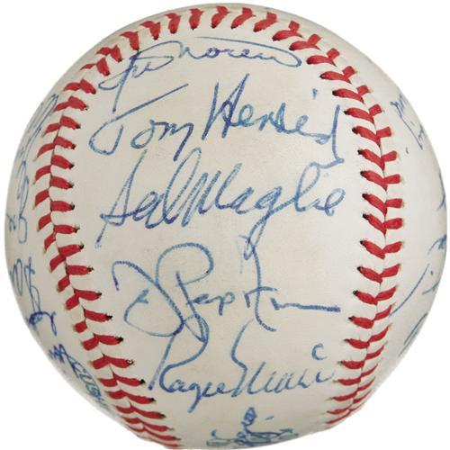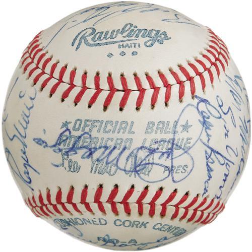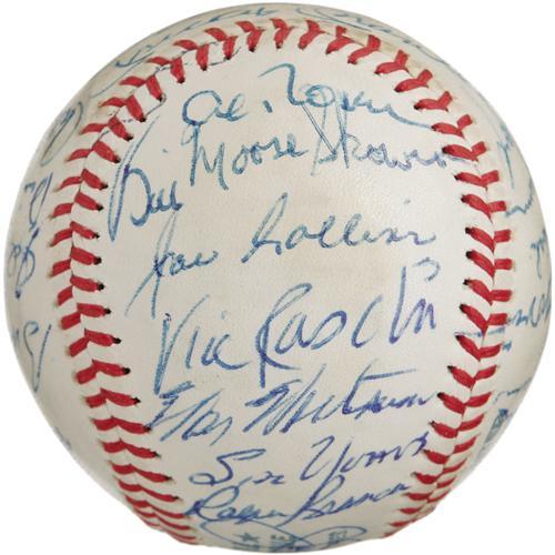 <B>1980's New York Yankees Old Timers Signed Baseball with DiMaggio, Mantle, Maris.</B></I> Show your pinstriped pride and bid aggressively on this wonderful OAL (MacPhail) sphere. After all, how often do you find Joe, Mickey and Roger all together on a single ball? And the fun doesn't end there--also present are Ford, Skowron, Raschi, Branca, Pepitone, Henrich, Avila and many more. Twenty-five autographs are here in total, with none dipping below 9/10 in strength. The ball shows some light, scattered toning, but nothing that could cause much concern. What a day in the Bronx it must have been! <I>LOA from PSA/DNA. LOA from James Spence Authentication.</B></I><BR><BR><b>Shipping:</b> Balls, Pucks, etc., Small (<a target="_blank" href="http://www.heritageauctions.com/common/shipping.php">view shipping information</a>)