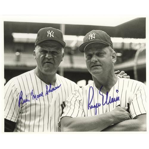 <B>1980's Roger Maris & Moose Skowron Signed Photograph.</B></I> Teammates during that historic 1961 season, Moose and Rajah reunite in pinstripes for an Old Timers event at the Stadium. Each has applied his 10/10 blue sharpie signature to the 8x10" photograph from the event, creating a Mint collectible for the ages. Signed Maris photos are getting tougher and tougher, so wise collectors are snapping them up now. <I>LOA from PSA/DNA. LOA from James Spence Authentication.</B></I><BR><BR><b>Shipping:</b> Small Flat (<a target="_blank" href="http://www.heritageauctions.com/common/shipping.php">view shipping information</a>)