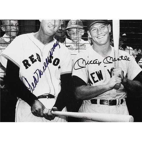 <B>1980's Ted Williams & Mickey Mantle Signed Large Photograph.</B></I> With young Fenway fans jockeying for a peek behind them, the Splendid Splinter and the Commerce Comet display the tools of their trade for a photographer. This rarely seen image is expanded to impressive 13x19" dimensions, and signed by each in 10/10 blue and black sharpie respectively. Photo is matted and framed to a final size of 18.5x25". <I>LOA from PSA/DNA. LOA from James Spence Authentication.</B></I><BR><BR><b>Shipping:</b> Flat Material, Small (<a target="_blank" href="http://www.heritageauctions.com/common/shipping.php">view shipping information</a>)