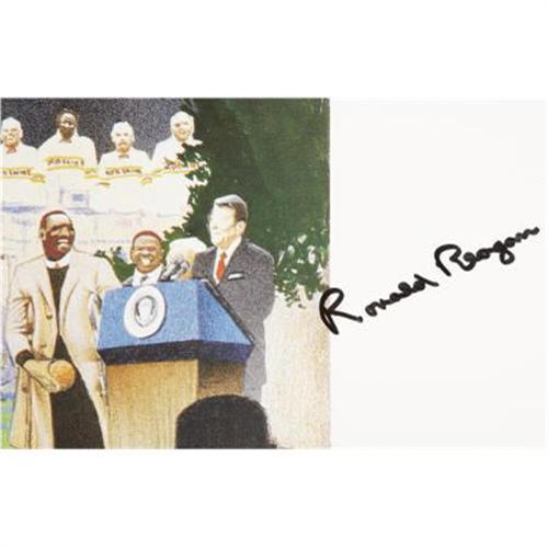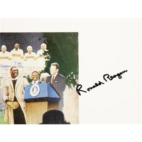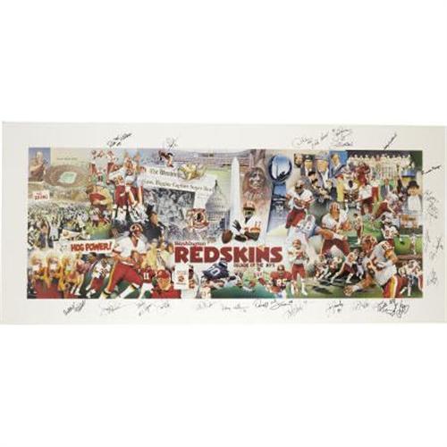 <B>1980's Washington Redskins Signed Oversized Print with Ronald Reagan.</B></I> President Reagan fittingly highlights this impressive print celebrating football in the nation's capital during the Eighties, as there was surely no bigger name in that town than the Gipper. Joining him in 10/10 black sharpie are John Riggins, Jack Kent Cooke, Bobby Bethard, Ronald Reagan, Joe Jacoby, Russ Grimm, Art Monk, Darell Green, Joe Theisman, Bobby Mitchell, Joe Gibbs, Doug Williams and more. Twenty-five autographs are here in total, running the perimeter of the 28x61" print, which is mounted on a foam core backing for display. Massive and almost certainly one of a kind, this is a piece that should rise to the top of any true Redskins fan's want list. <I>LOA from PSA/DNA. LOA from James Spence Authentication.</B></I><BR><BR><b>Shipping:</b> Flat Material, Large (<a target="_blank" href="http://www.heritageauctions.com/common/shipping.php">view shipping information</a>)