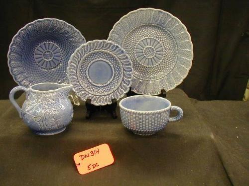 1980'S PORTUGAL BLUE VERY DETAILED RELIEF 4 PC. LUNCH SET INCLUDES (1) 8in PLATE, (1) CUP & (1) MATCHING SAUCER (1) 7 1/2in DIA BOWL, (1) CREAMER EXCELLENT, 5 PC