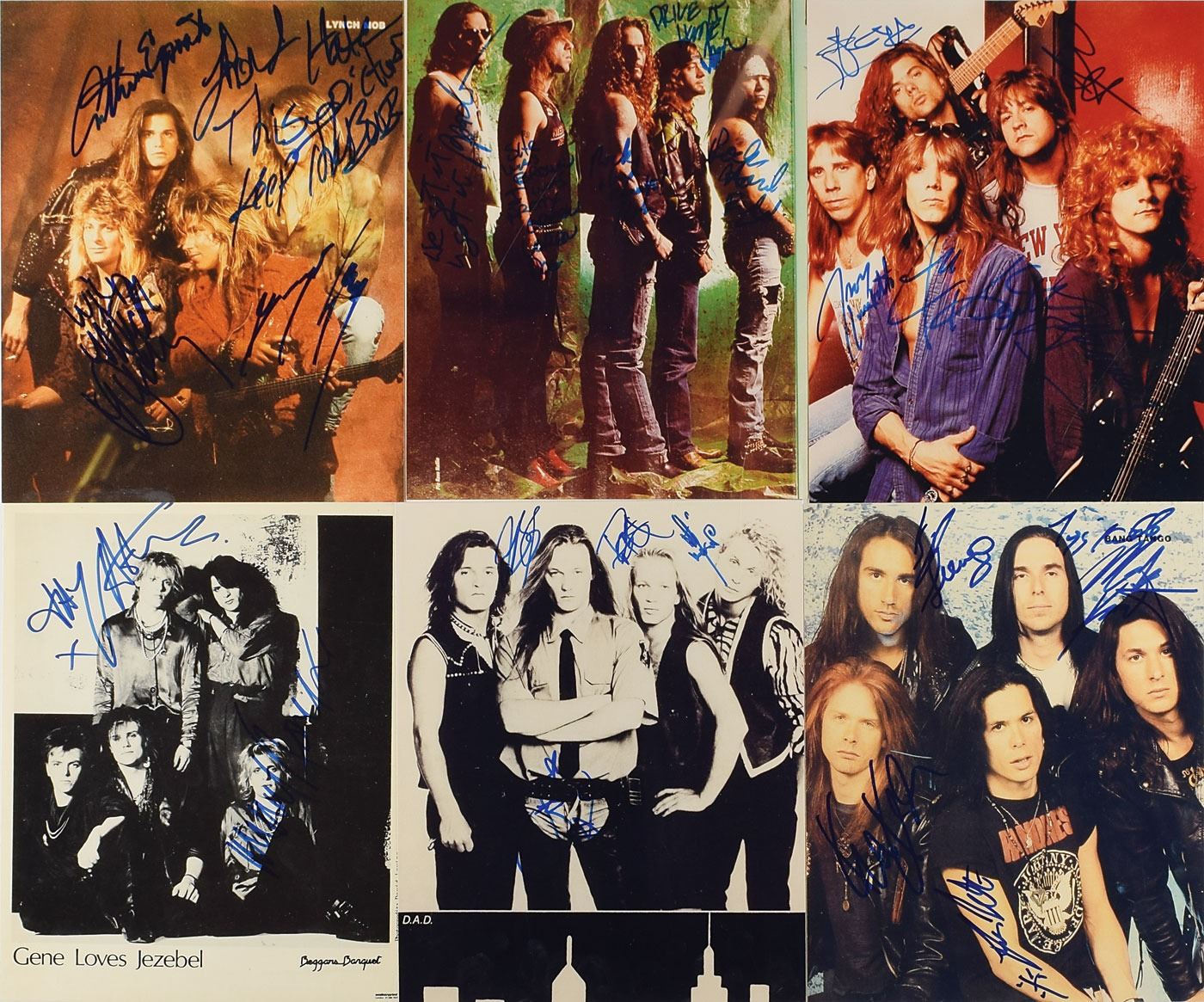Group of six glossy photos, each approximately 8 x 10, each signed in blue felt tip by the pictured 1980s rock band: Bang Tango, D-A-D, Gene Loves Jezebel, Little Caesar, Lynch Mob, and Tesla. In overall fine condition.