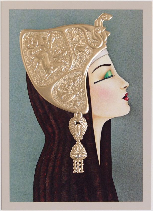 This is a vintage 1980s greeting card with artwork by David Layton. The gold headdress is in relief. Fiori Graphics, Inc. Printed in U.S.A. SIZE: Approx. 5" x 7". **MORE cards from 1950s to 1990s (risque, nude, art sci-fi, oddities) in this and future auctions. From the estate of a big collector who traveled the world and had some very scare paper items. Many postcards from small independent underground printers in Germany, Holland, France, UK, etc.