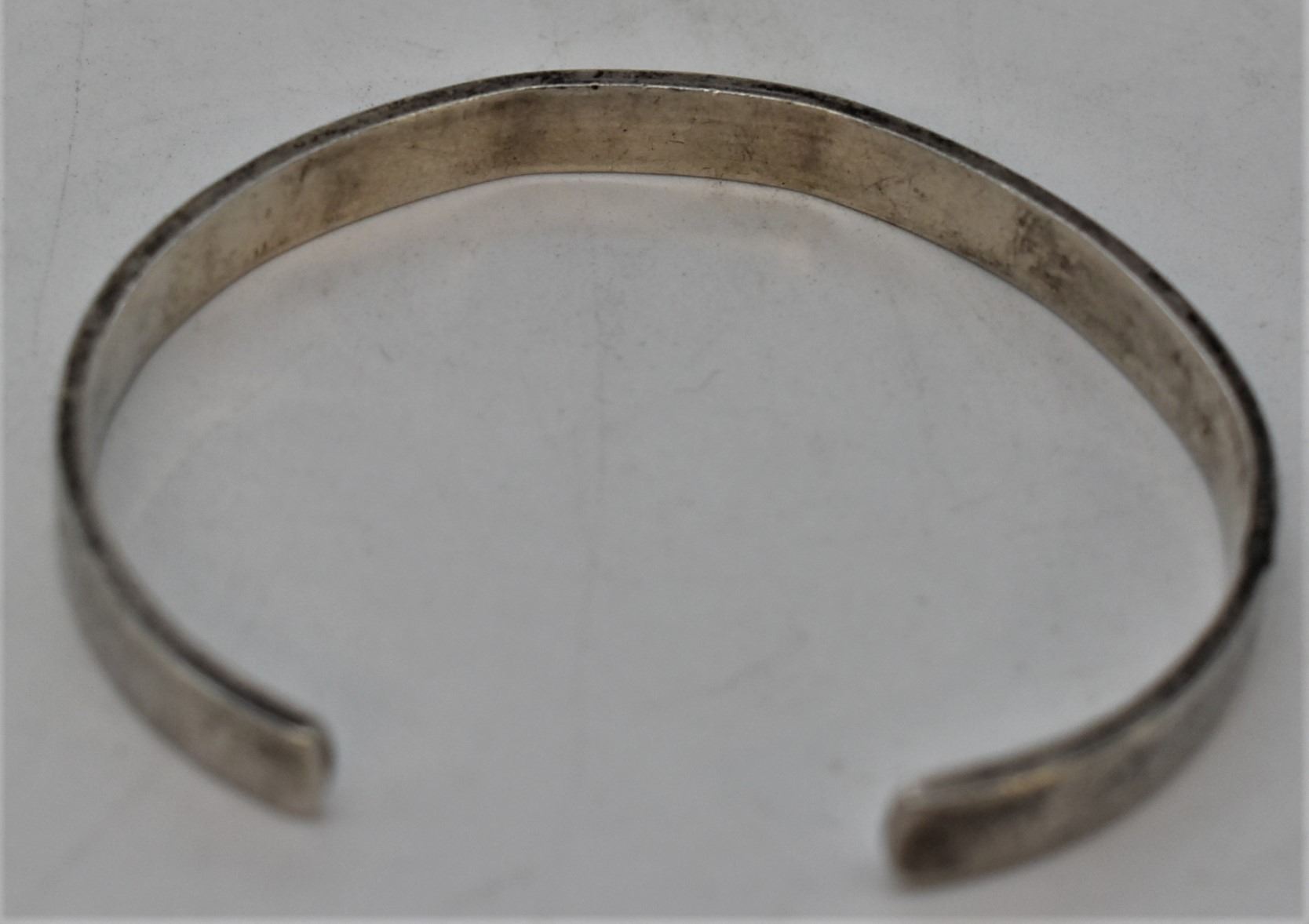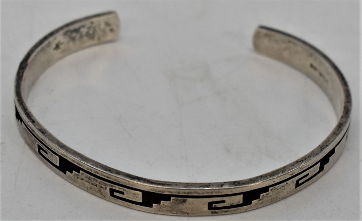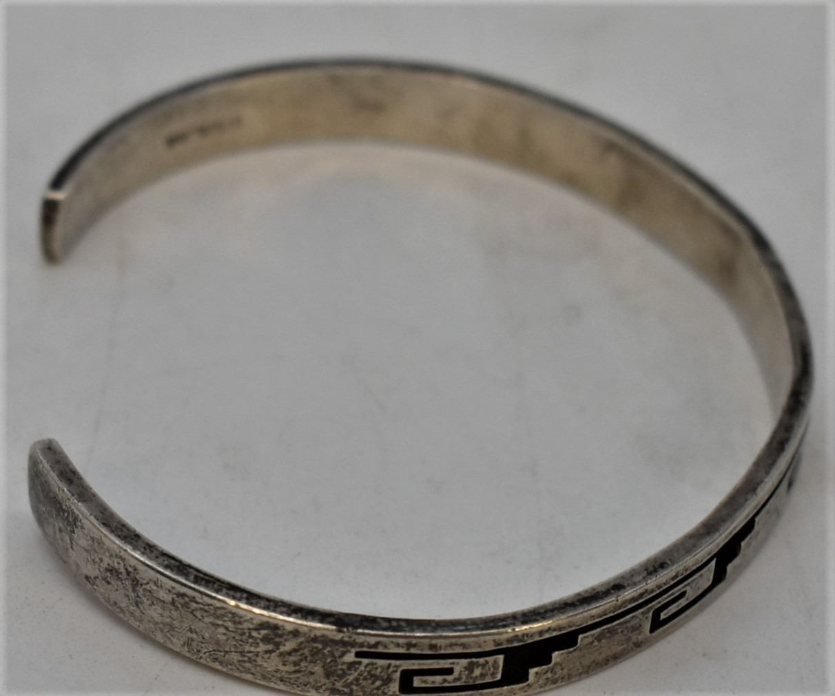 1980s Native American Hopi Sterling Overlay Bracelet by Terrance Lomayestewa, inside measures 6.75'' which includes the gap x .25''W, water wave designs, stamped sterling and has artist's picto hallmark on back, total gram wt. of 13.2