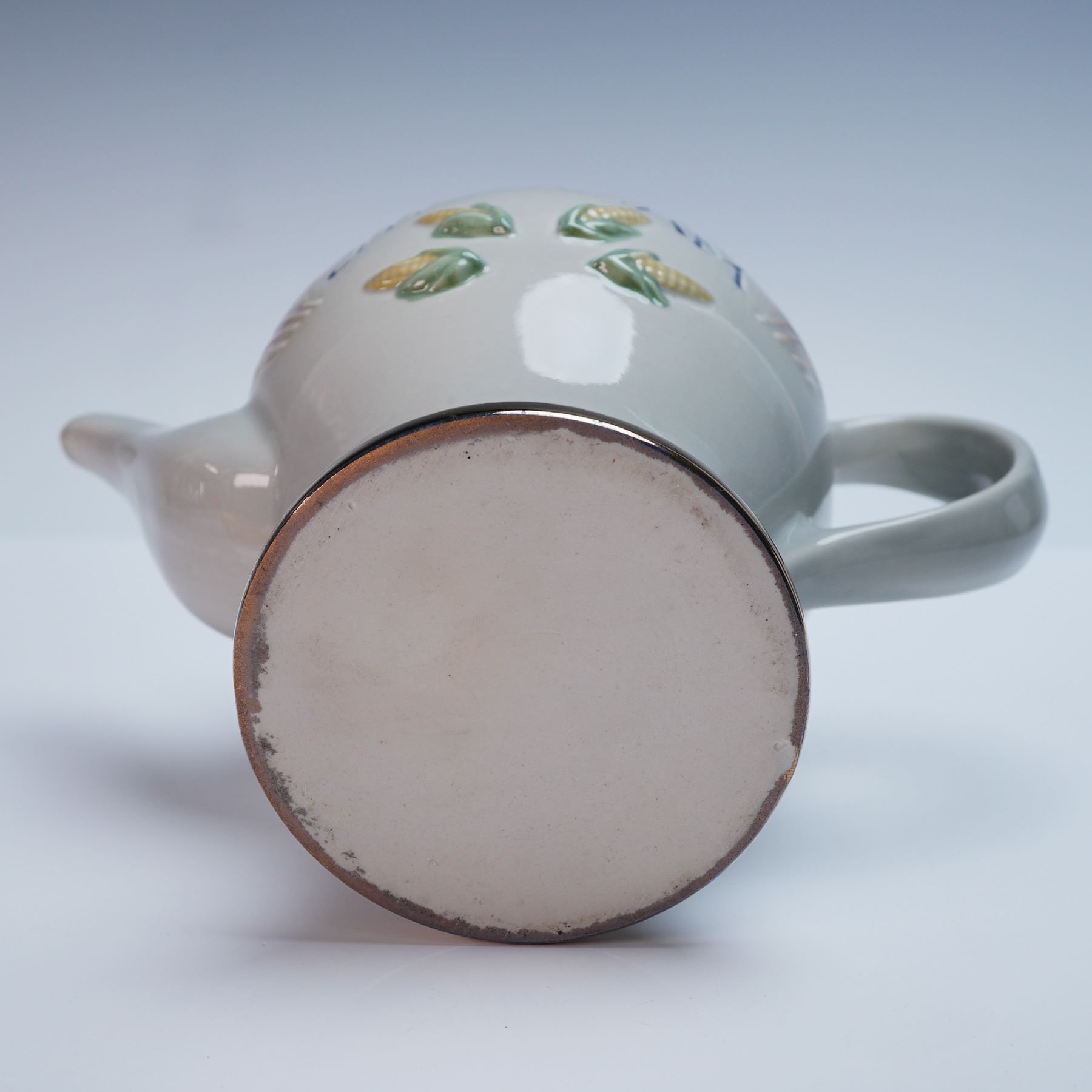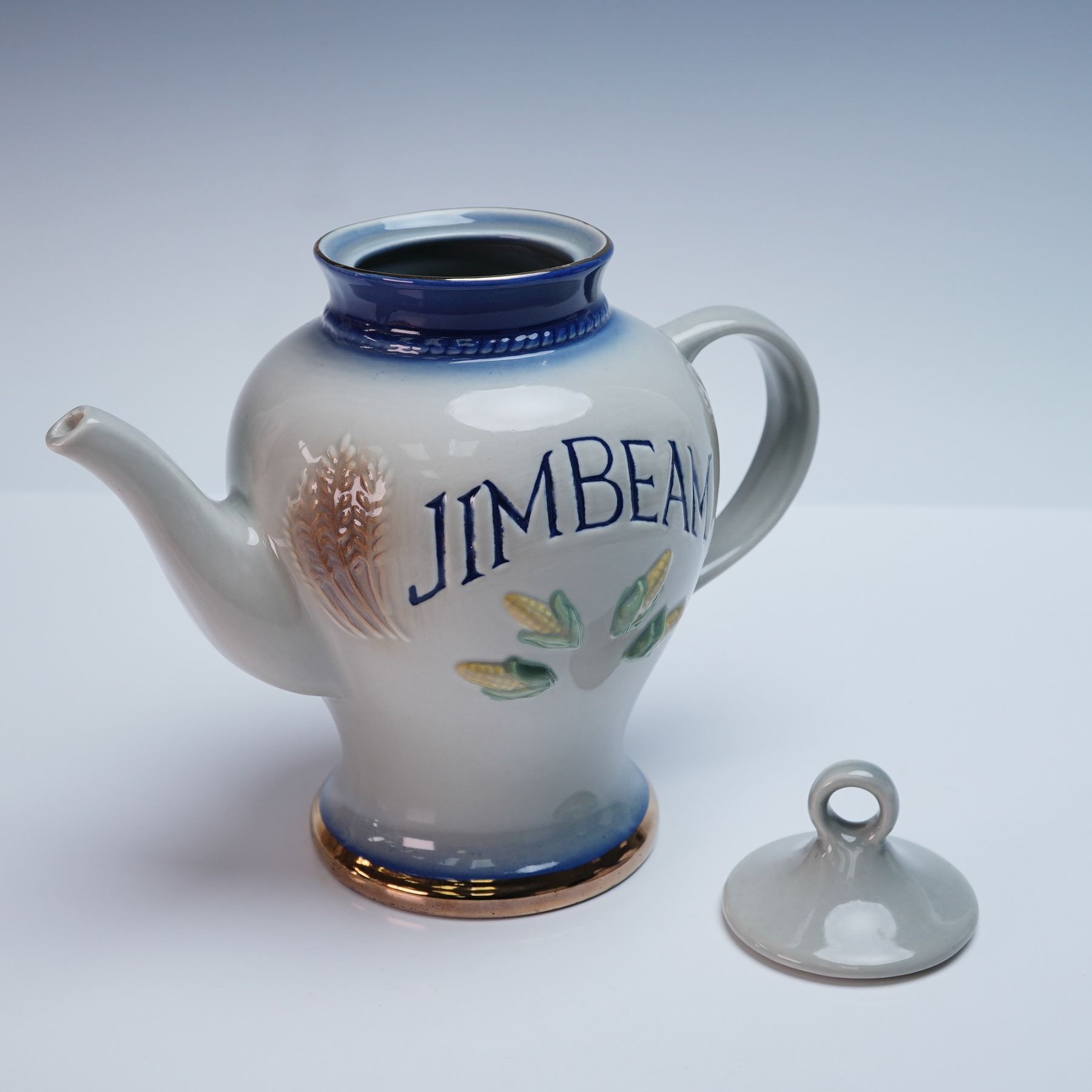 Vintage 1980 Jim Beam ceramic teapot decanter with lid, crafted by Regal China Corporation for the James B. Beam Distilling Co. Features raised "JIM BEAM" lettering, corn detailing, and metallic gold-tone accents. Great for collectors of breweriana, vintage barware, or quirky Americana.
