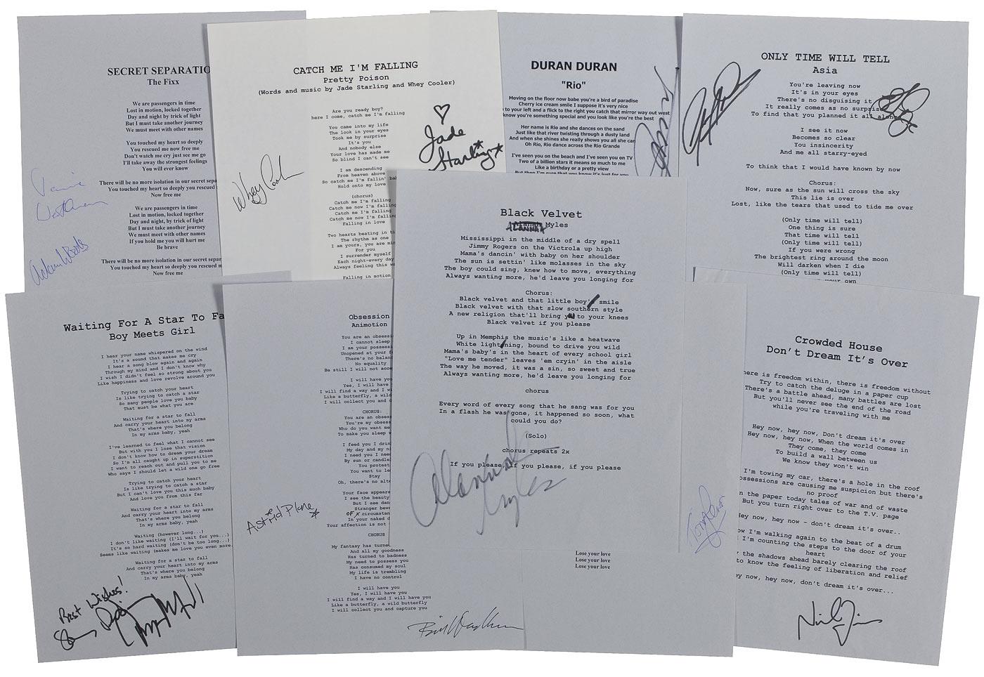 Printed souvenir lyrics to nine hits of the 1980s, each signed in ink or felt tip by the respective artist or members of the group. Signers are: Don’t Dream It’s Over (Crowded House, signed by Neil Finn; Waiting for a Star to Fall (Boy meets Girl, signed by Shannon Rubicam and George Merrill; Catch Me I’m Falling (Pretty Poison), signed by Jade Starling and Wade Cooler; Only Time Will Tell (Asia), signed by Geoff Downes and Jon Payne; Rio (Duran Duran), signed by John Taylor; Black Velvet signed by Alannah Myles; Secret Separation (The Fixx), signed by Cy Curnin, Jaime West Oram, and Adam Woods; Your Love (The Outfield), signed by Tony Lewis; and Obsession (Animotion), signed by Astrid Plane, Bill Wadhams, and Charles Ottavio. In fine overall condition. RRAuction COA.