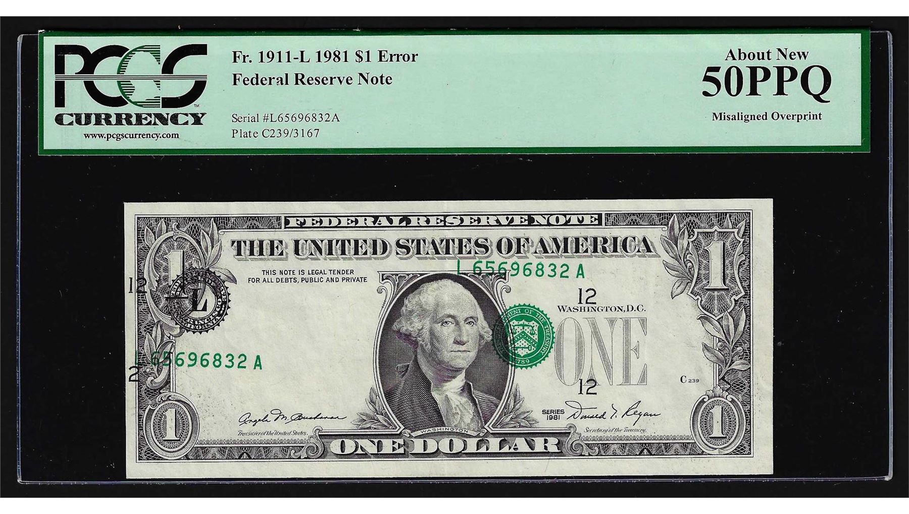 One 1981 $1 Federal Reserve ERROR Note Misaligned Overprint PCGS About New 50PPQ. PCGS Graded.