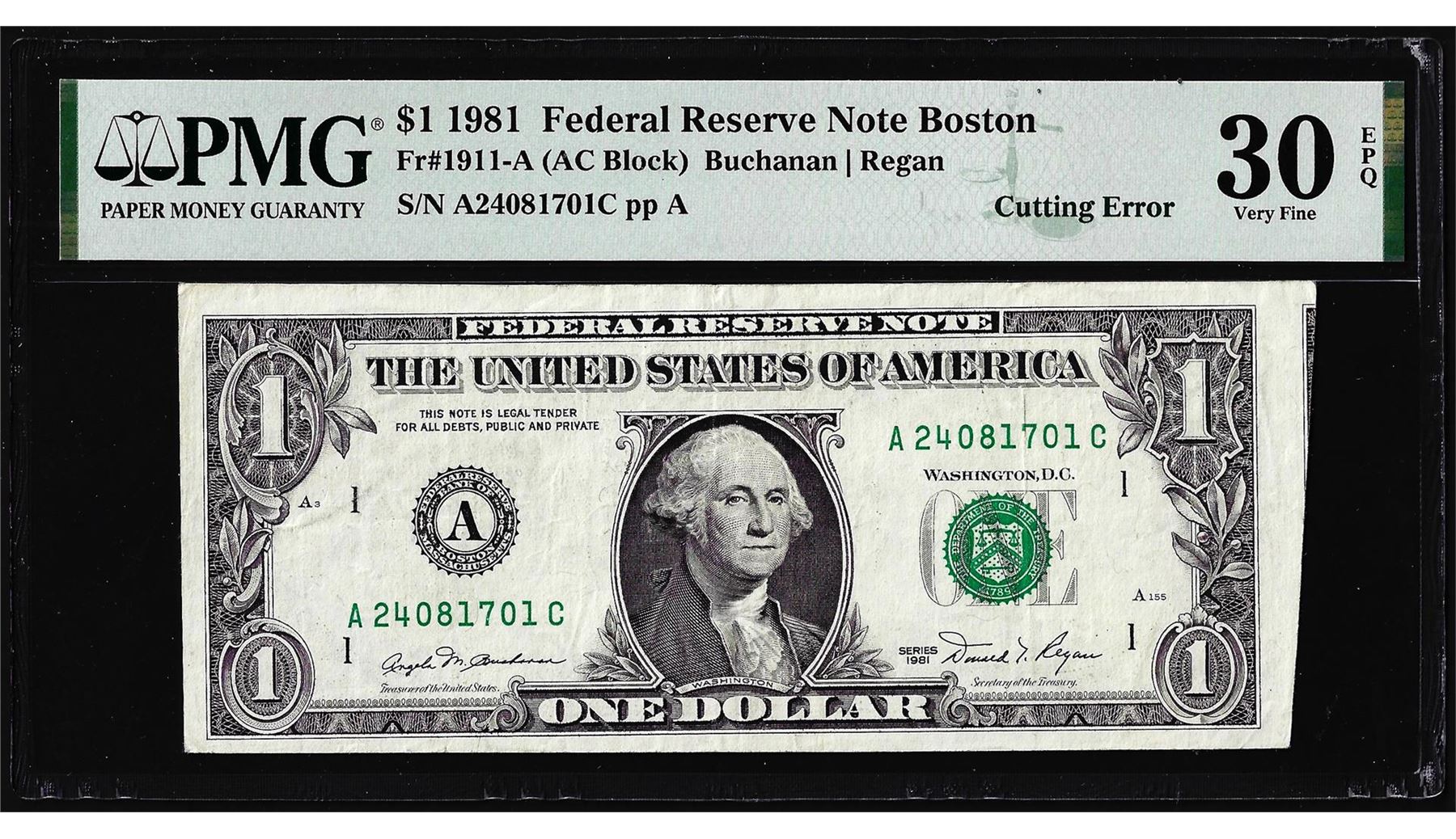 1981 $1 Federal Reserve Note Cutting Error Boston Fr.1911-A PMG Very Fine 30EPQ