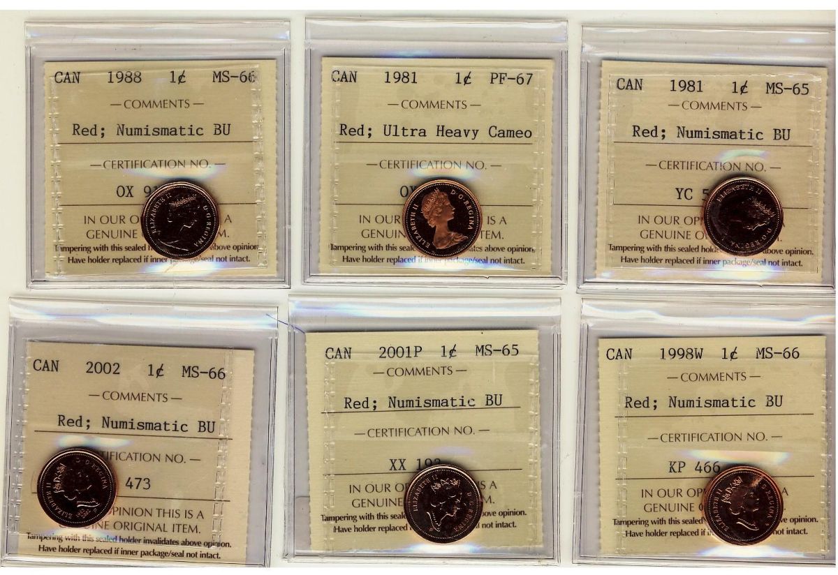 1981 1¢ ICCS MS65 Red Num Bu, 1981 PF67 Red Ultra Heavy Cameo, 1988 ICCS MS66 Red numismatic BU, 1998W ICCS MS66 Red Numismatic BU, 2001P ICCS MS65 Red Numismatic Bu, 2002 ICCS MS66 Red Numismatic BU. Lot of 6 coins.