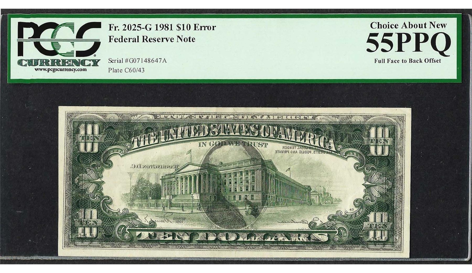 One 1981 $10 Federal Reserve Note ERROR Full Face-Back Offset PCGS Choice About New 55PPQ. PCGS Graded.