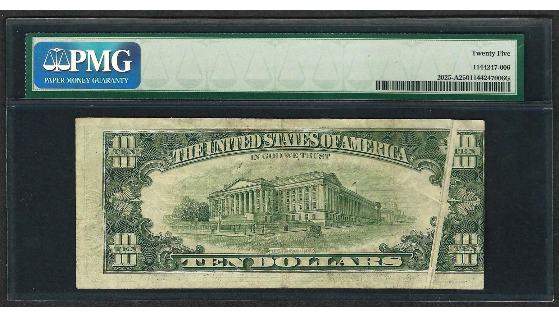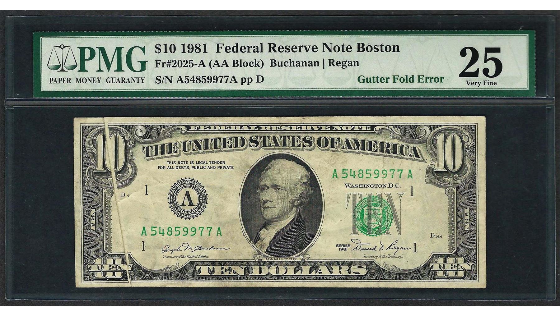 One 1981 $10 Federal Reserve Note ERROR Gutter Fold PMG Very Fine 25. PMG Certified.