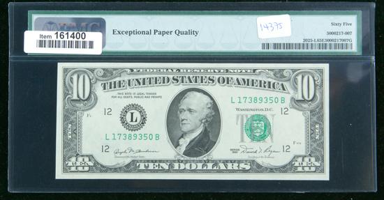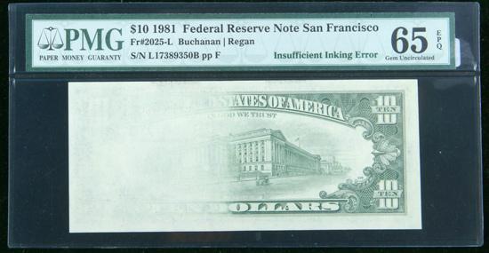 1981, $10 Federal Reserve Note. Insufficient Inking on Back. PMG Gem Uncirculated 65EPQ. . Fr-2025-L. The left half of the back printing was underinked, leaving a sharp image on the right end that fades to a ghost image on the left end.