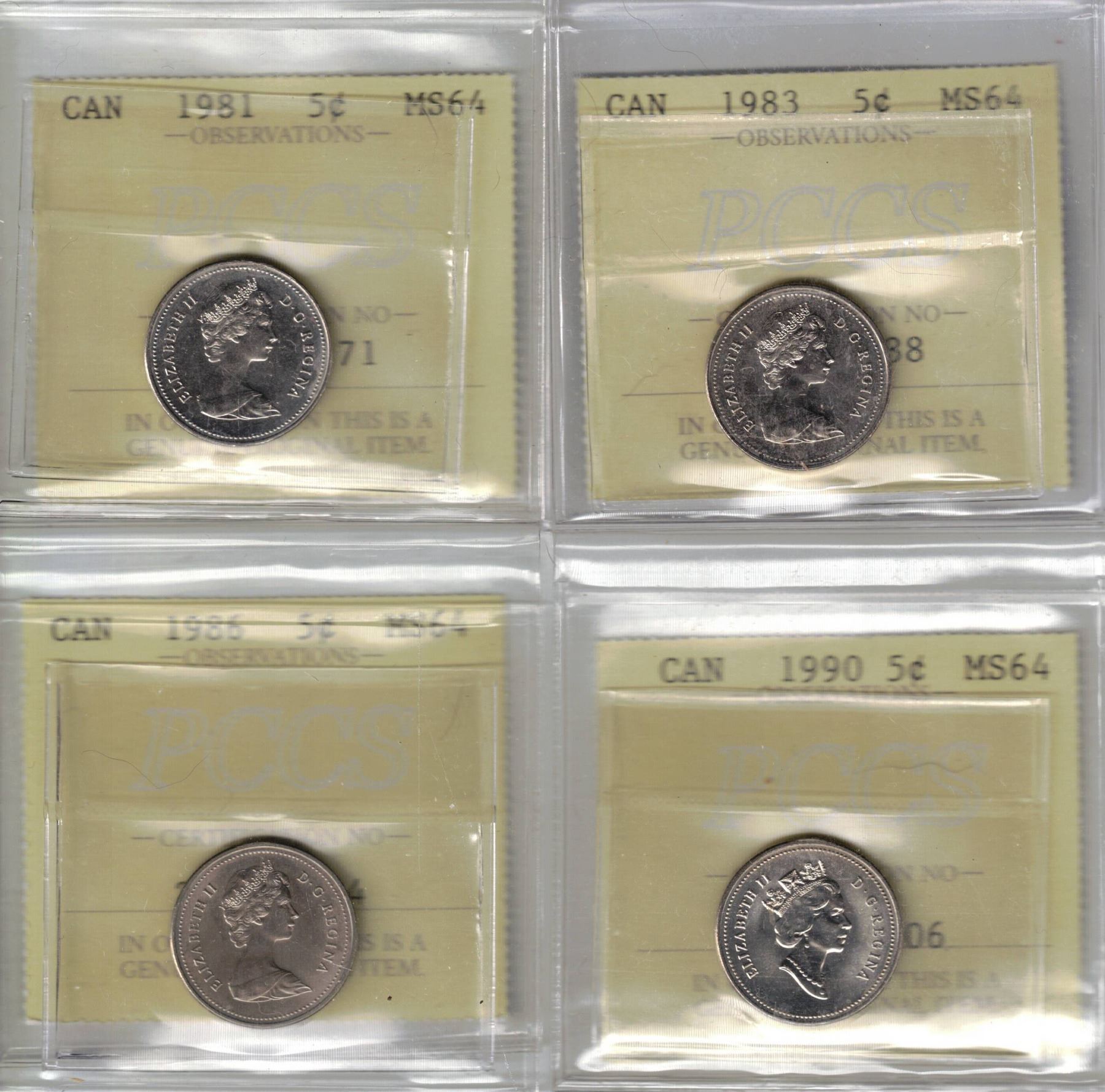 1981-1983-1986-1990 5¢ PCCS MS64 4Pcs (Professional Coin Certification System)