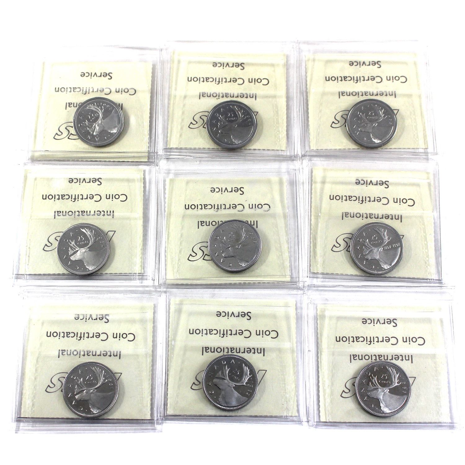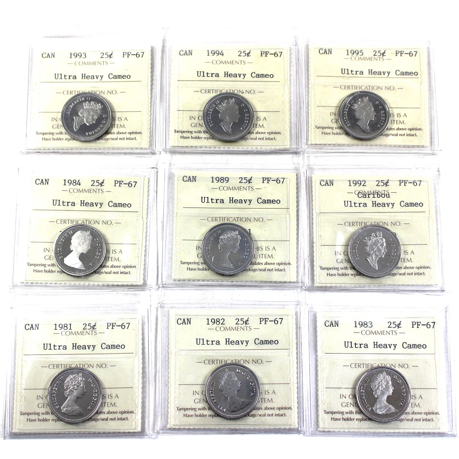 1981-1984, 1989 & 1992-1995 Canada 25-cent ICCS PF-67 Ultra Heavy Cameo. 9pcs