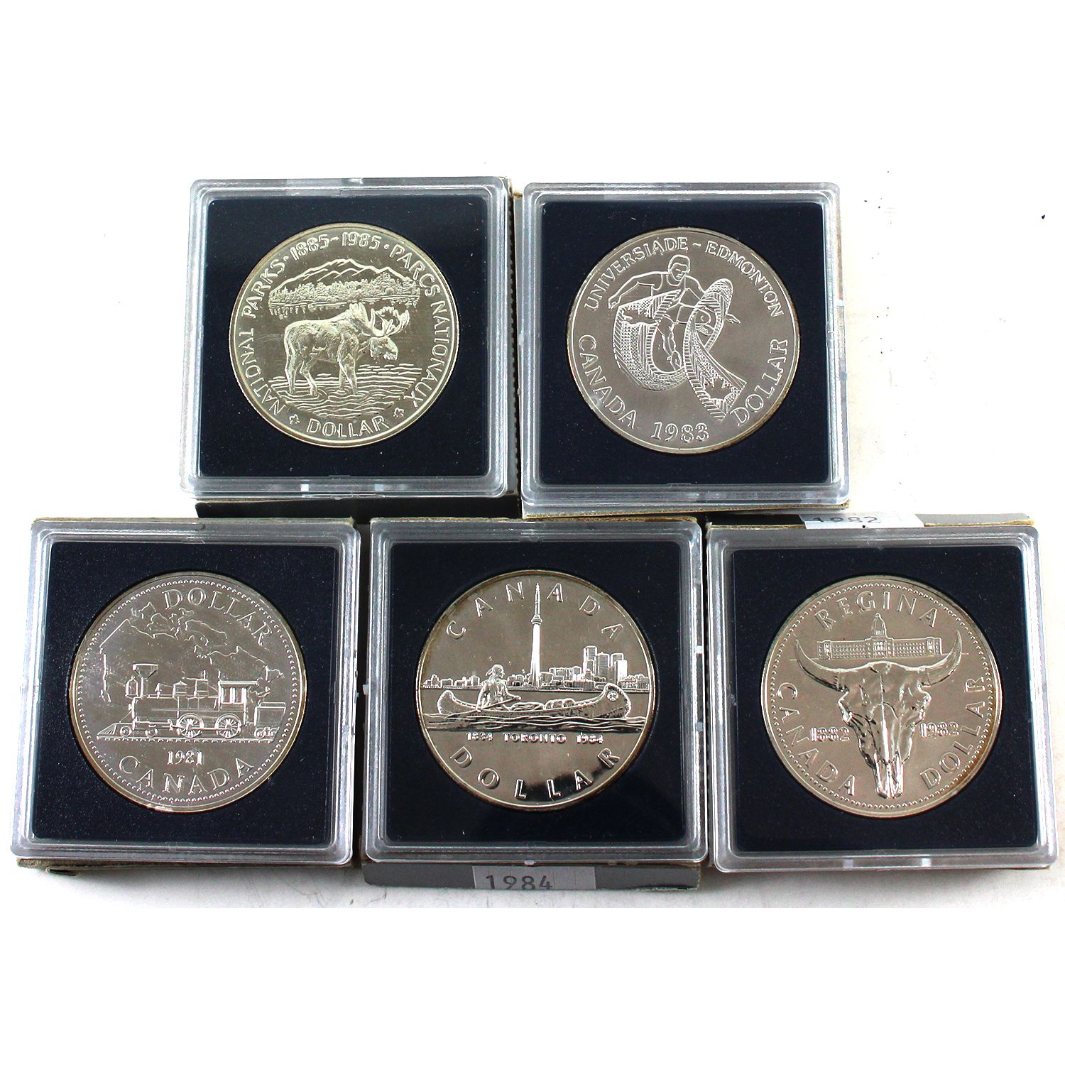 INCLUDES: 1981 Trans-Canada Railway Centennial, 1982 Founding of Regina, 1983 World University Games, 1984 Toronto Sesquicentennial & 1985 National Parks Centennial. 5pcs.