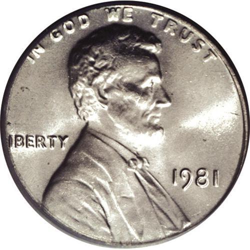 <B>1981<1C> Cent--Struck on a Clad Dime Planchet--MS65 PCGS.</B></I> Just a bit off center with complete rim definition at the top of the obverse and bottom of the reverse. This is a Gem example of this popular, wrong planchet error. The surfaces are bright and untoned with superior mint luster.