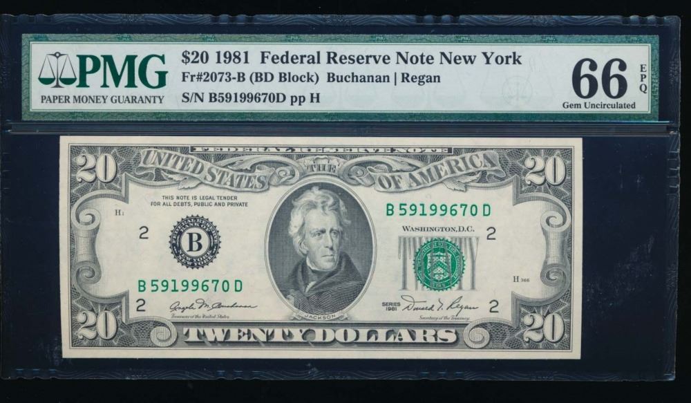 One 1981 $20 New York Federal Reserve Note PMG 66EPQ.