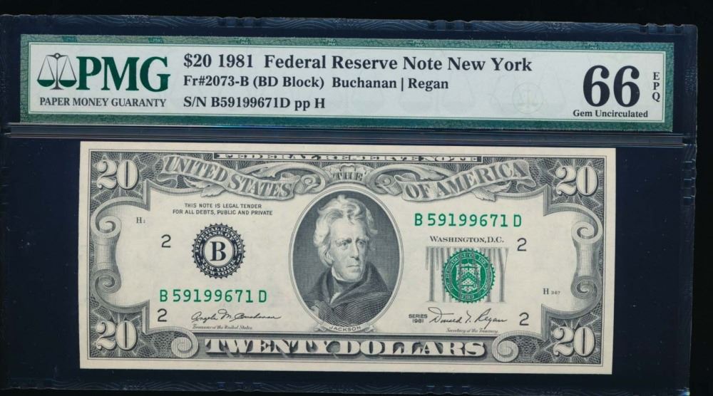 One 1981 $20 New York Federal Reserve Note PMG 66EPQ.