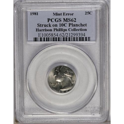 <B>1981-?<25C> Washington Quarter--Struck on a Dime Planchet--MS62 PCGS.</B></I> This unmarked wrong planchet error is uncentered toward 2 o'clock, with LIBERTY, the mintmark, and the denomination off the flan. Lightly toned in tan-gold shades.