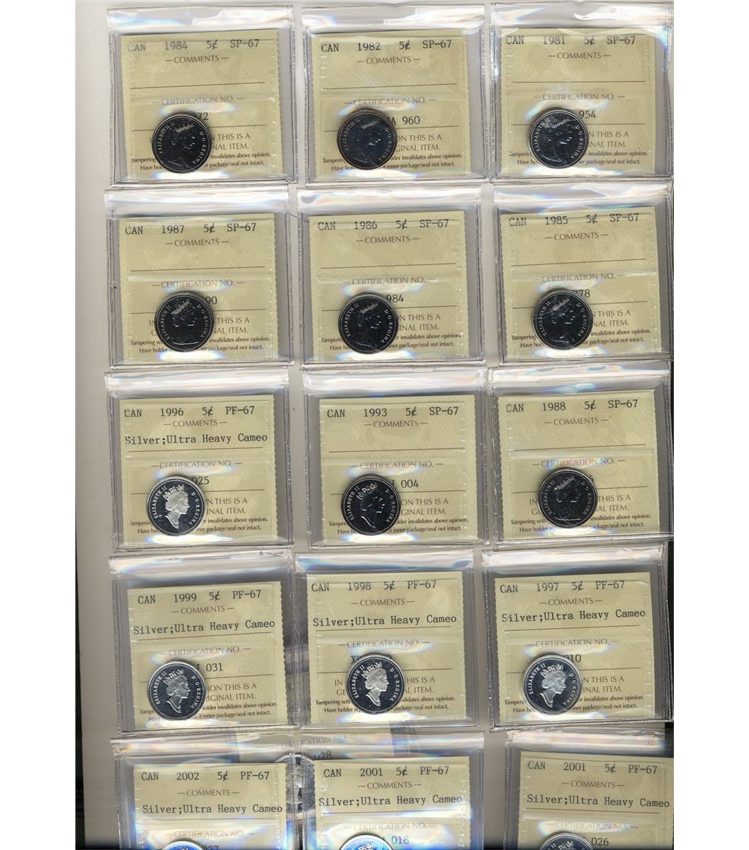 1981 5¢, 1982, 1984-1988, 1993 SP67 & 1996-1999, 2001(2), 2002, 2003, 2005(2), 2008, 2012 PF67. Lot of 20 coins all ICCS graded.