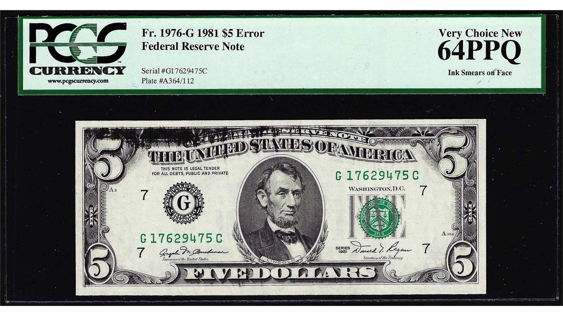 1981 $5 Federal Reserve Ink Smears on Face Error Note PCGS Choice New 64PPQ