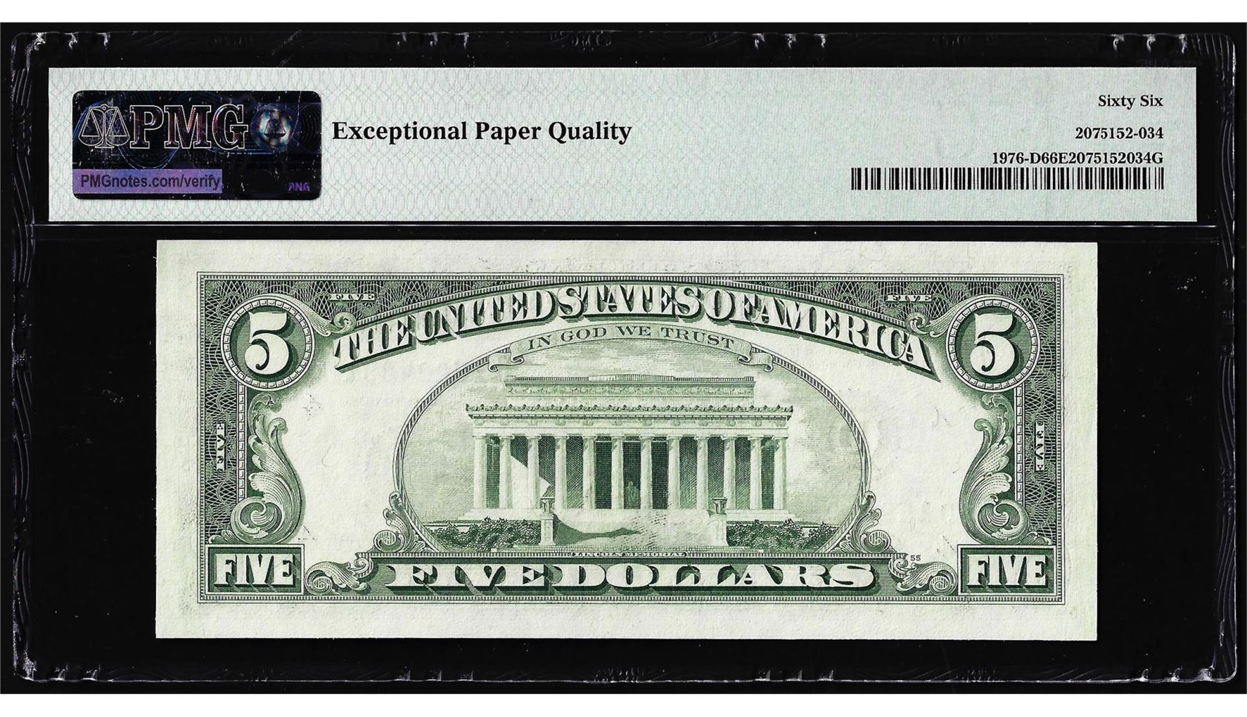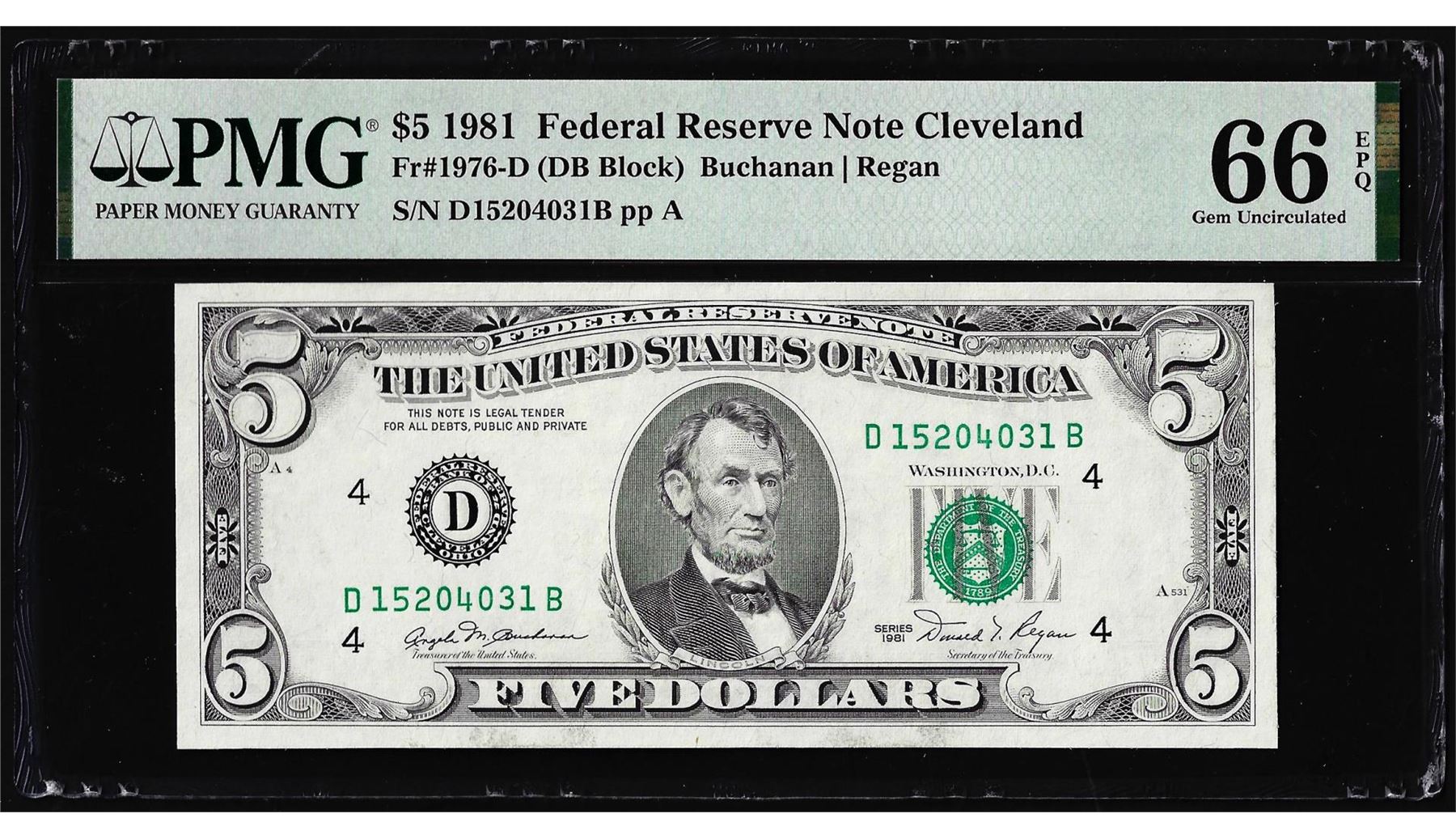 One 1981 $5 Federal Reserve Note Cleveland Fr.1976-D PMG Gem Uncirculated 66EPQ. PMG Certified.
