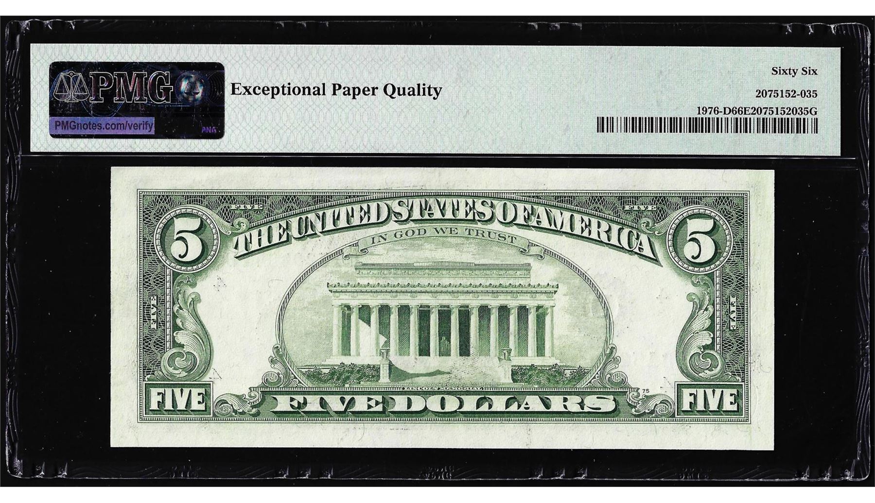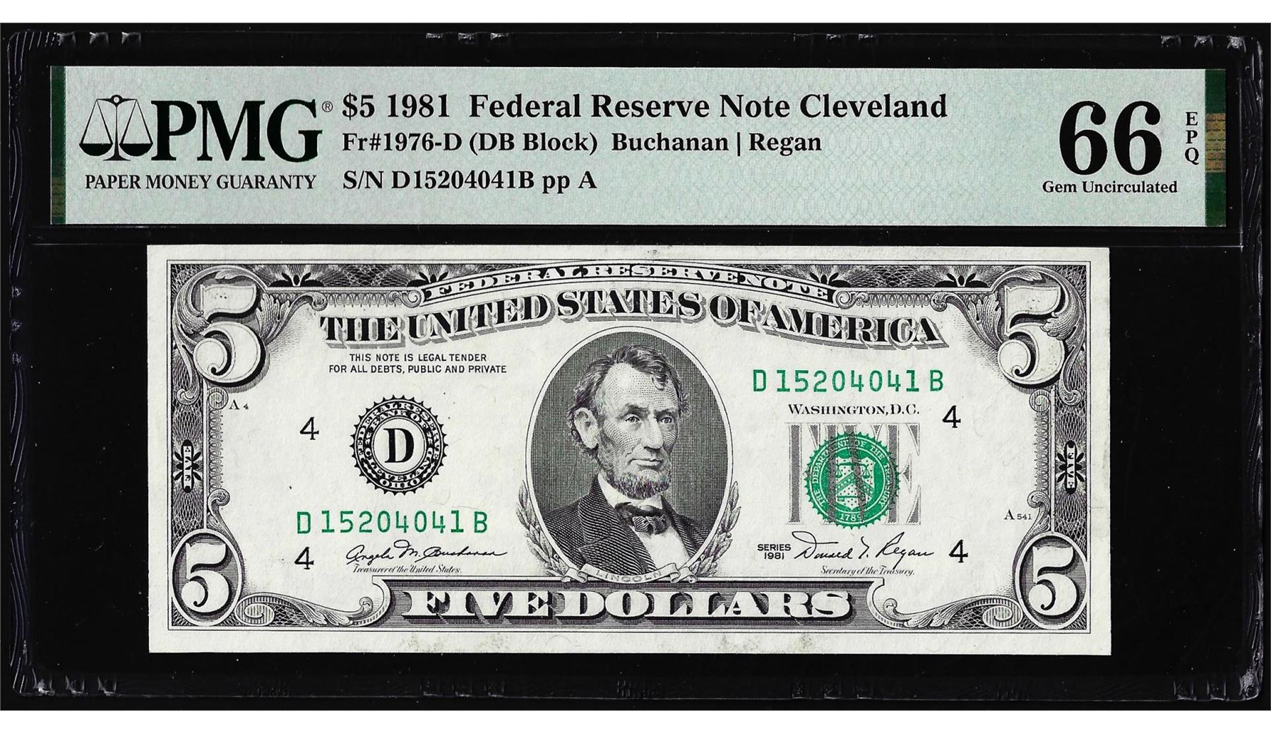 One 1981 $5 Federal Reserve Note Cleveland Fr.1976-D PMG Gem Uncirculated 66EPQ. PMG Certified.