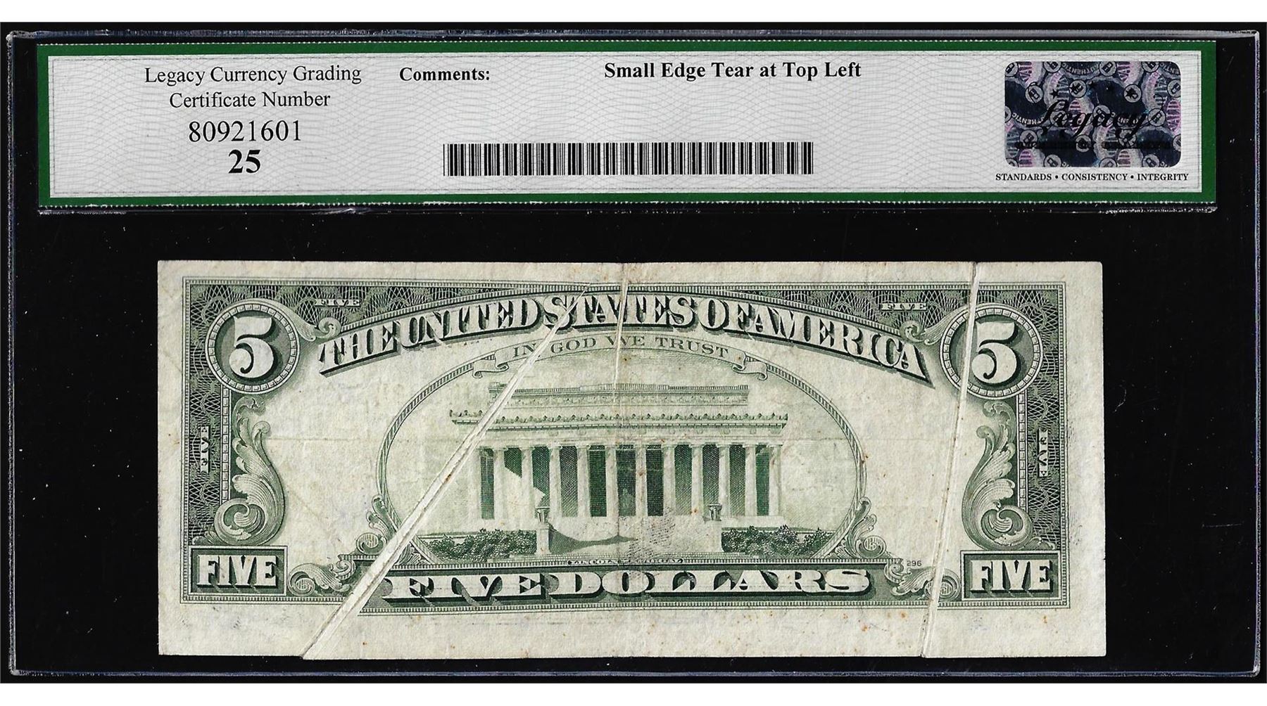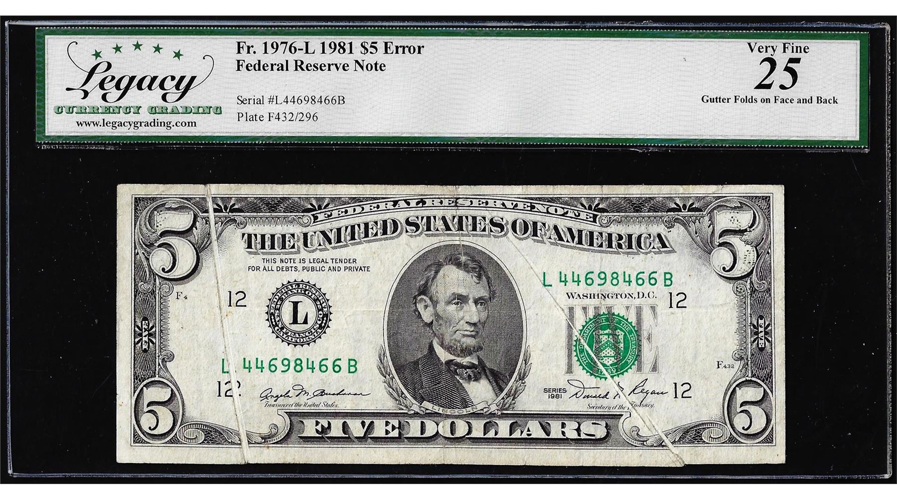 One 1981 $5 Federal Reserve Note Gutter Fold Error Legacy Very Fine 25. Legacy Graded.