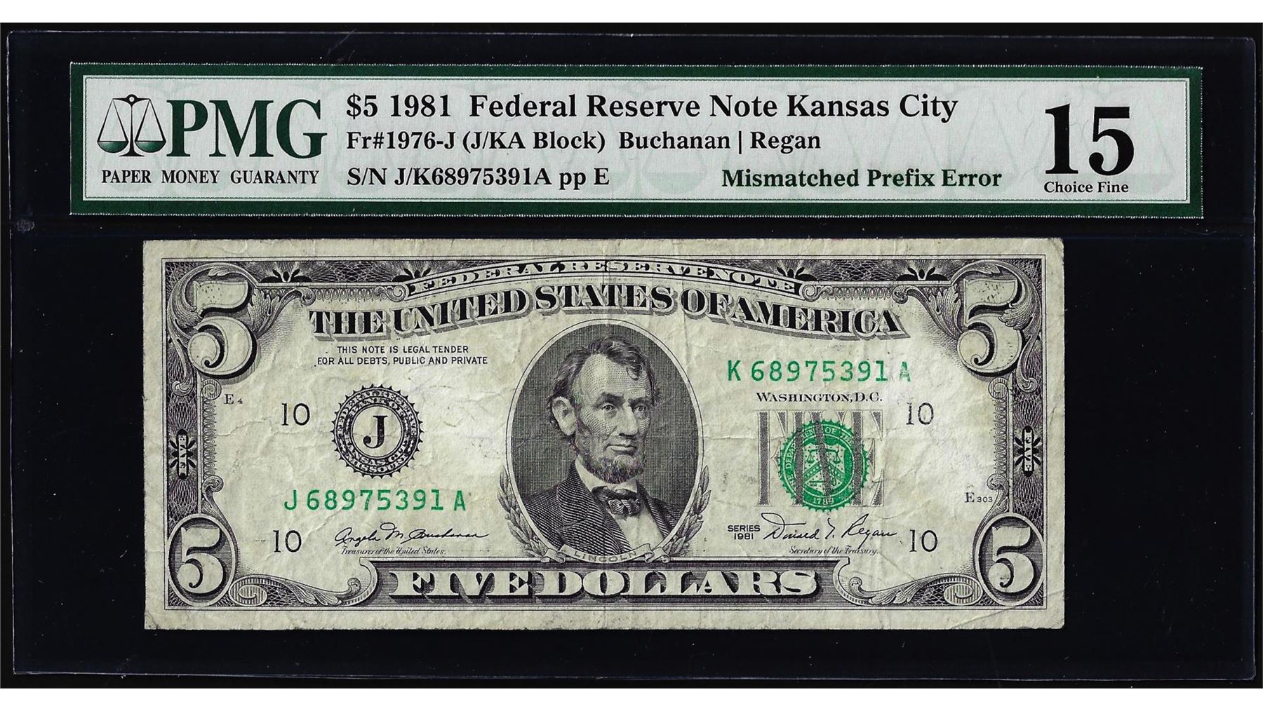 One 1981 $5 Federal Reserve Note Mismatched Prefix Error Fr.1976-J PMG Choice Fine 15. PMG Certified.