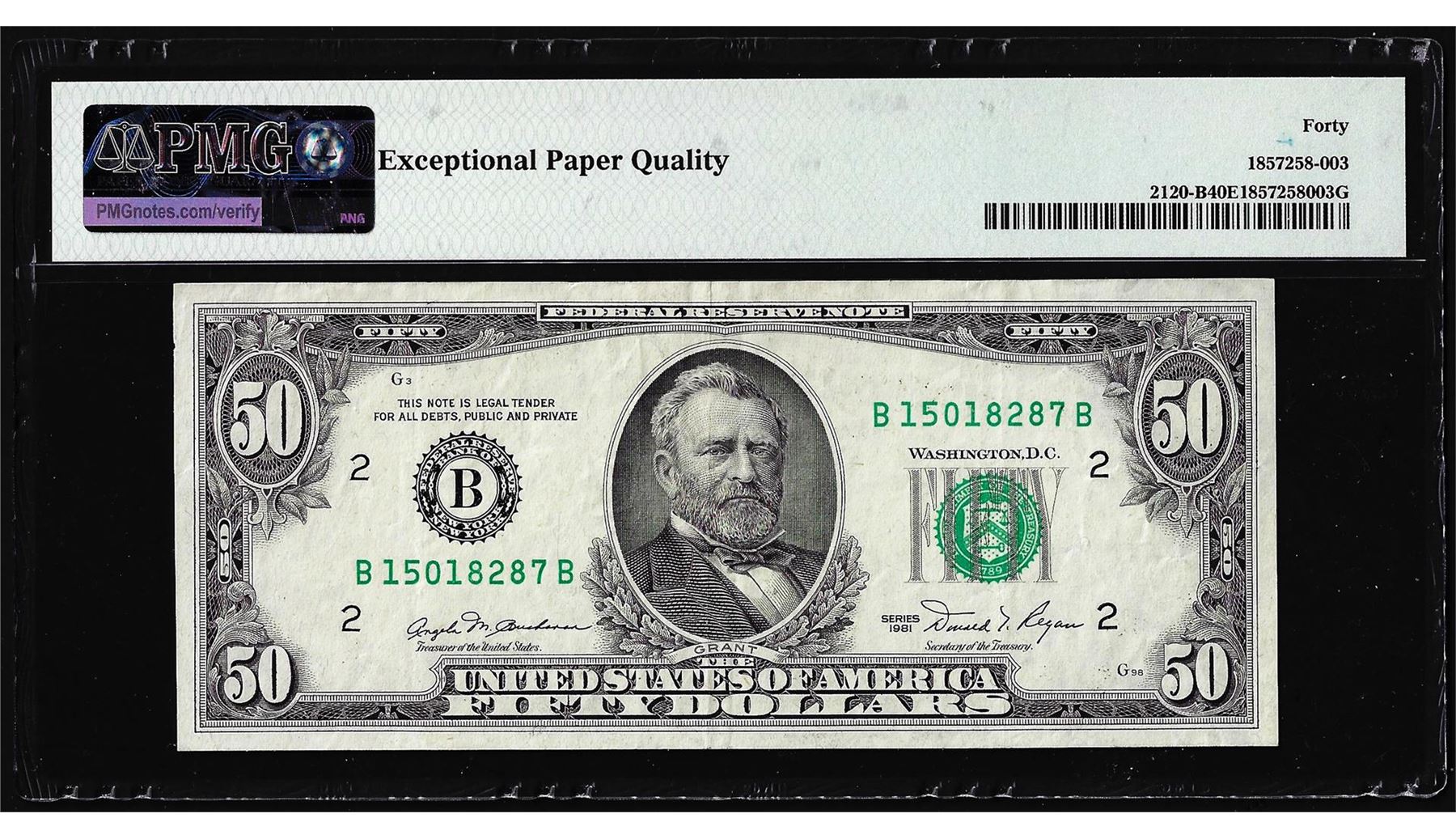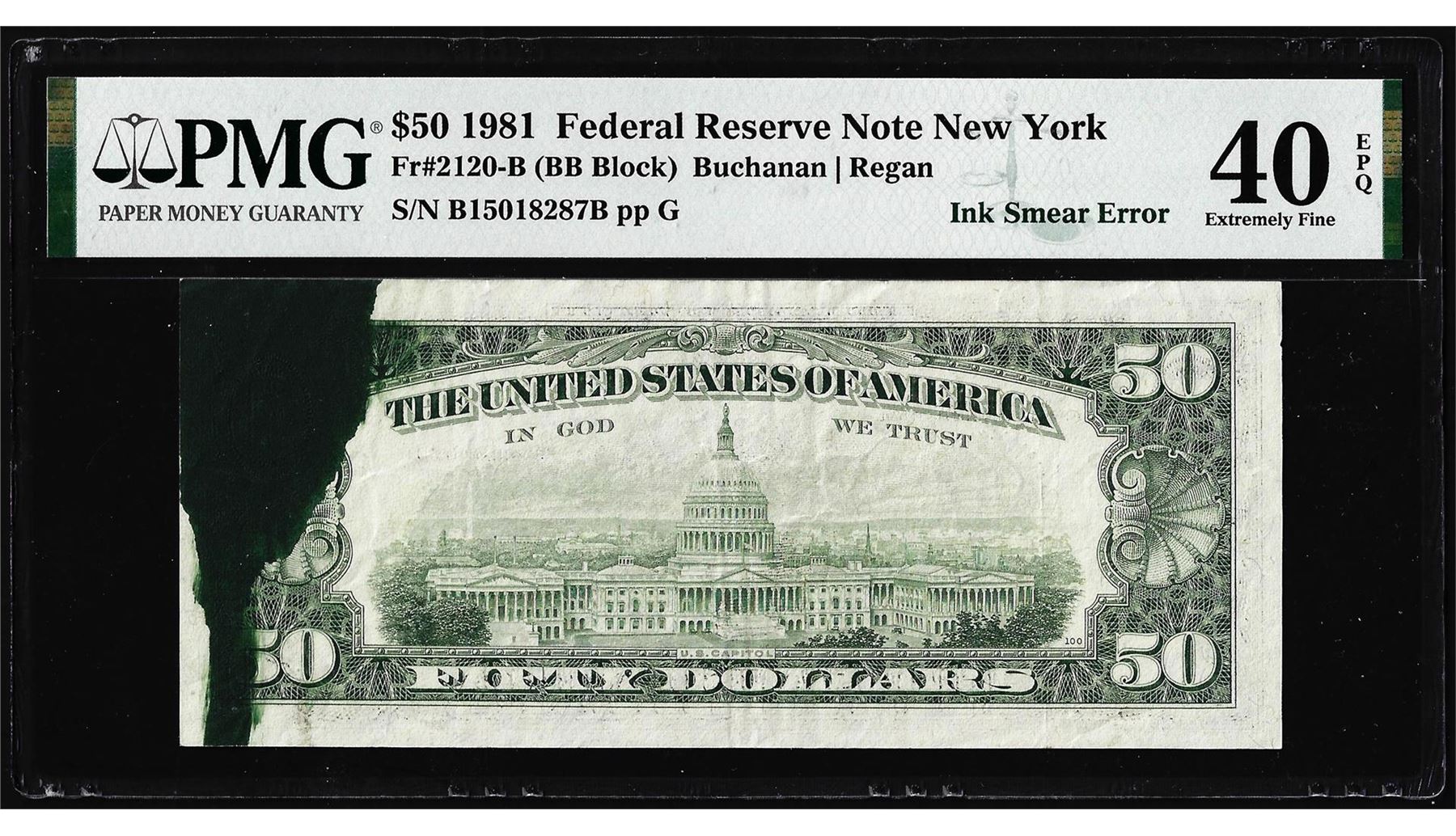 One 1981 $50 Federal Reserve Note Ink Smear Error PMG Extremely Fine 40EPQ. PMG Certified.