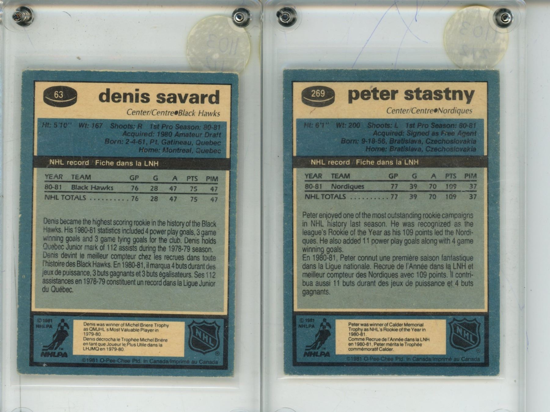 1981-82 Denis Savard OPC #63 Rookie Card and Peter Stastny #269