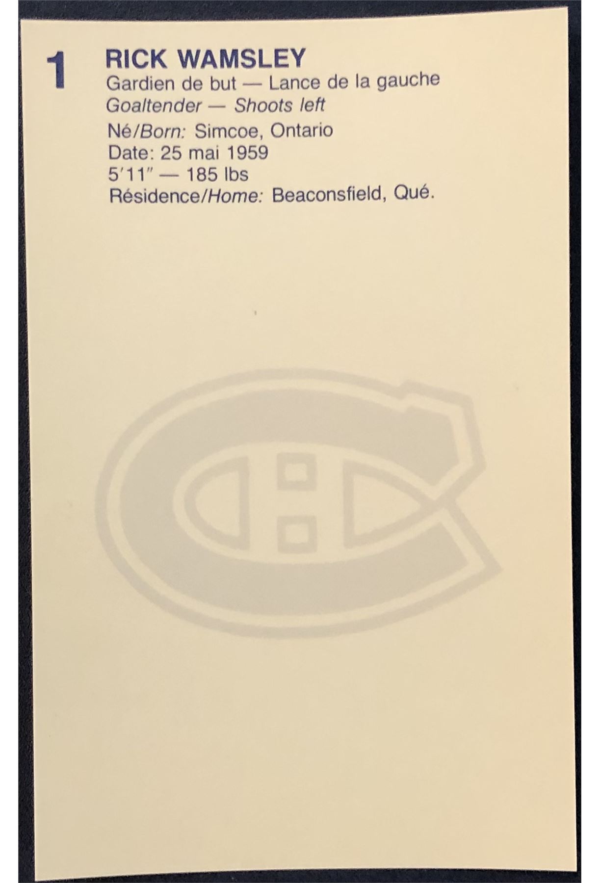 1981-82 MONTREAL CANADIENS POST CARD - RICK WAMSLEY
