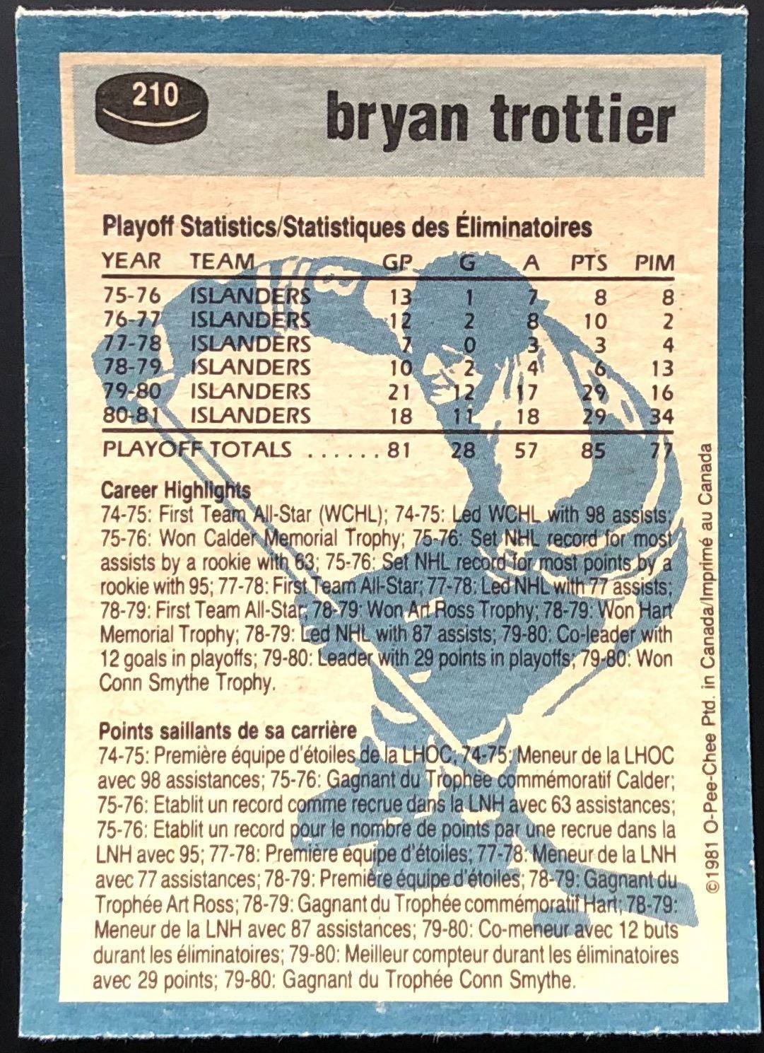 Card #210 NHL, hockey, OPC, vintage, hall of fame