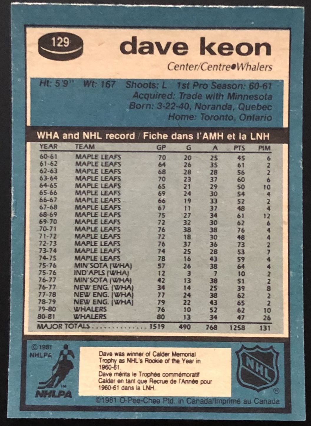 Card #129 OPC, vintage, NHL, hockey, hall of fame