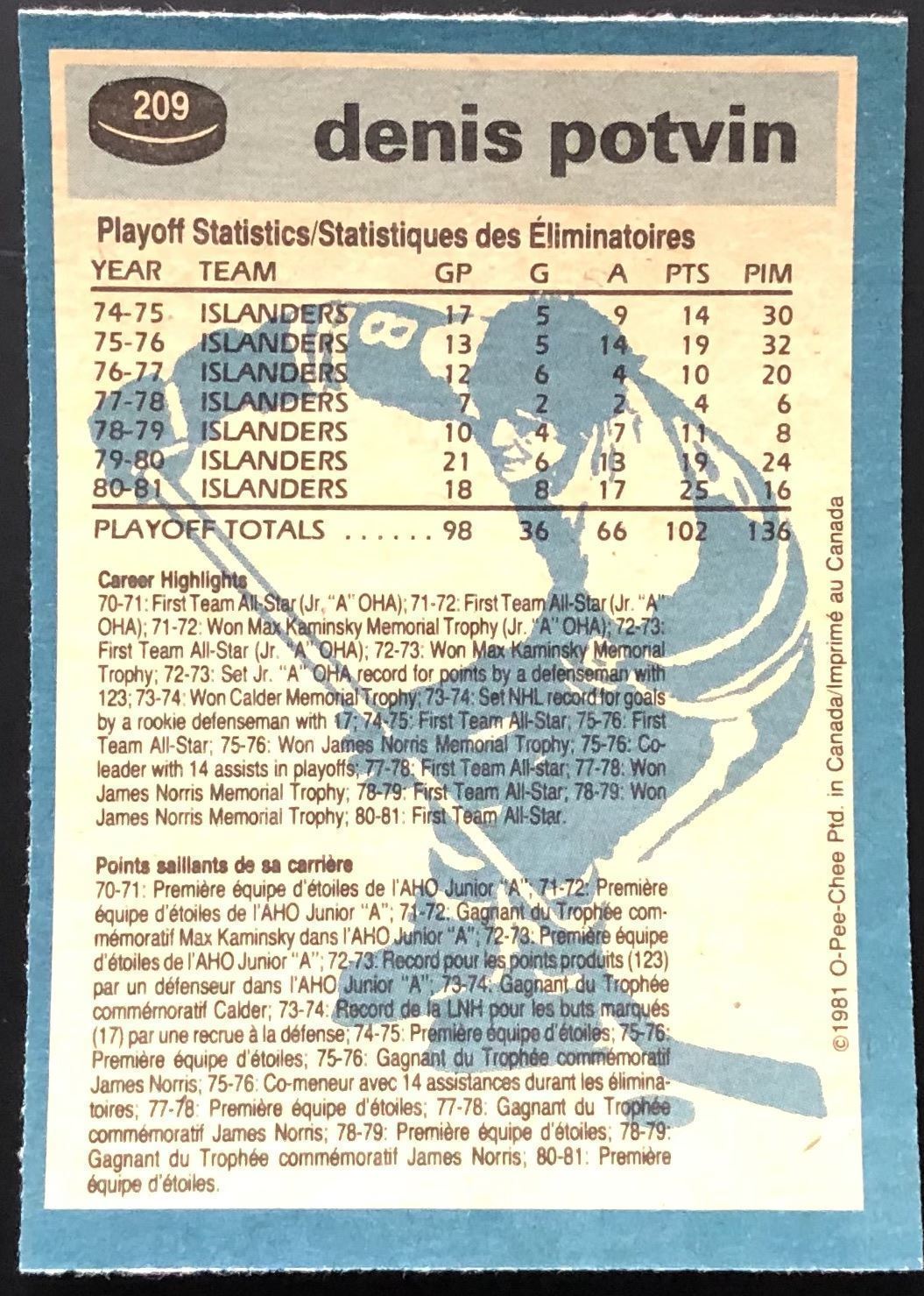 Card #209 NHL, hockey, OPC, vintage, hall of fame