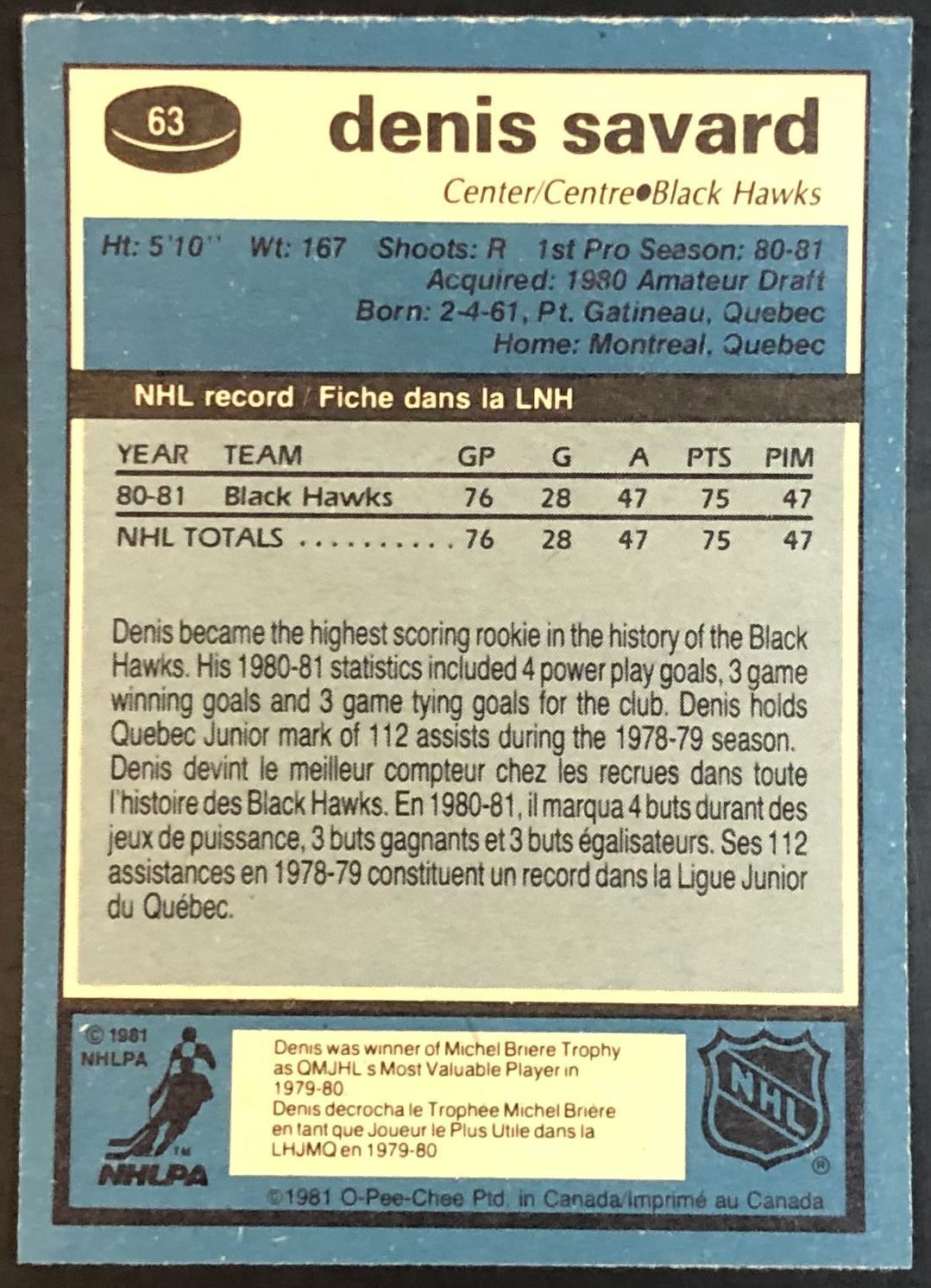 Card #63 NHL, hockey, OPC, vintage, hall of fame, rookie