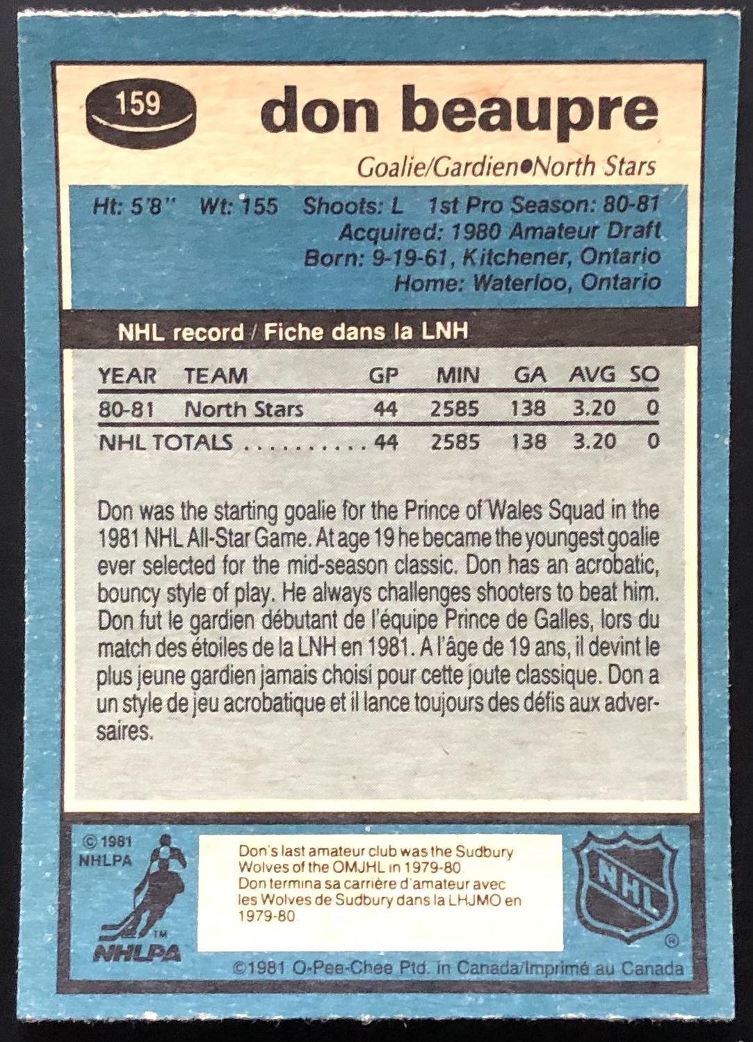 Card #159 NHL, hockey, OPC, vintage, rookie