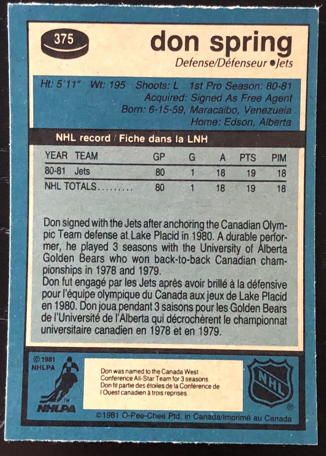 Card #375 NHL, hockey, OPC, vintage, rookie