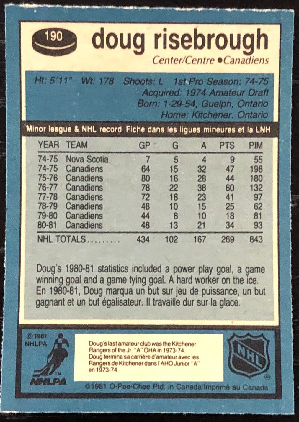 Card #190 OPC, NHL, hockey, vintage