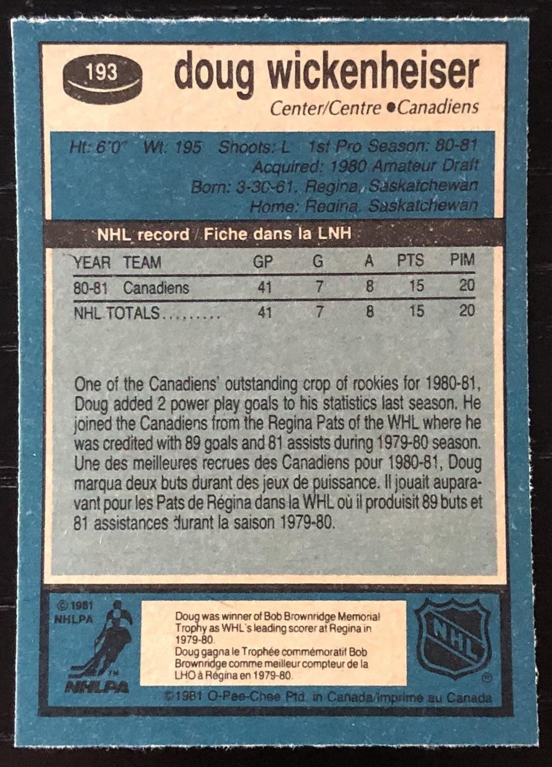 Card #193 NHL, hockey, OPC, vintage, rookie