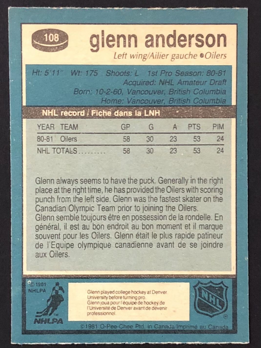 card #108 OPC, NHL, hall of fame, rookie