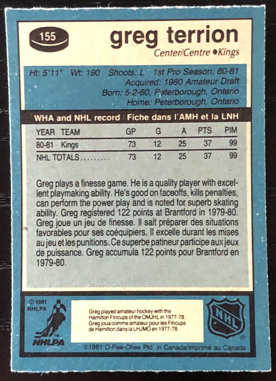 Card #155 NHL, hockey, OPC, vintage, rookie