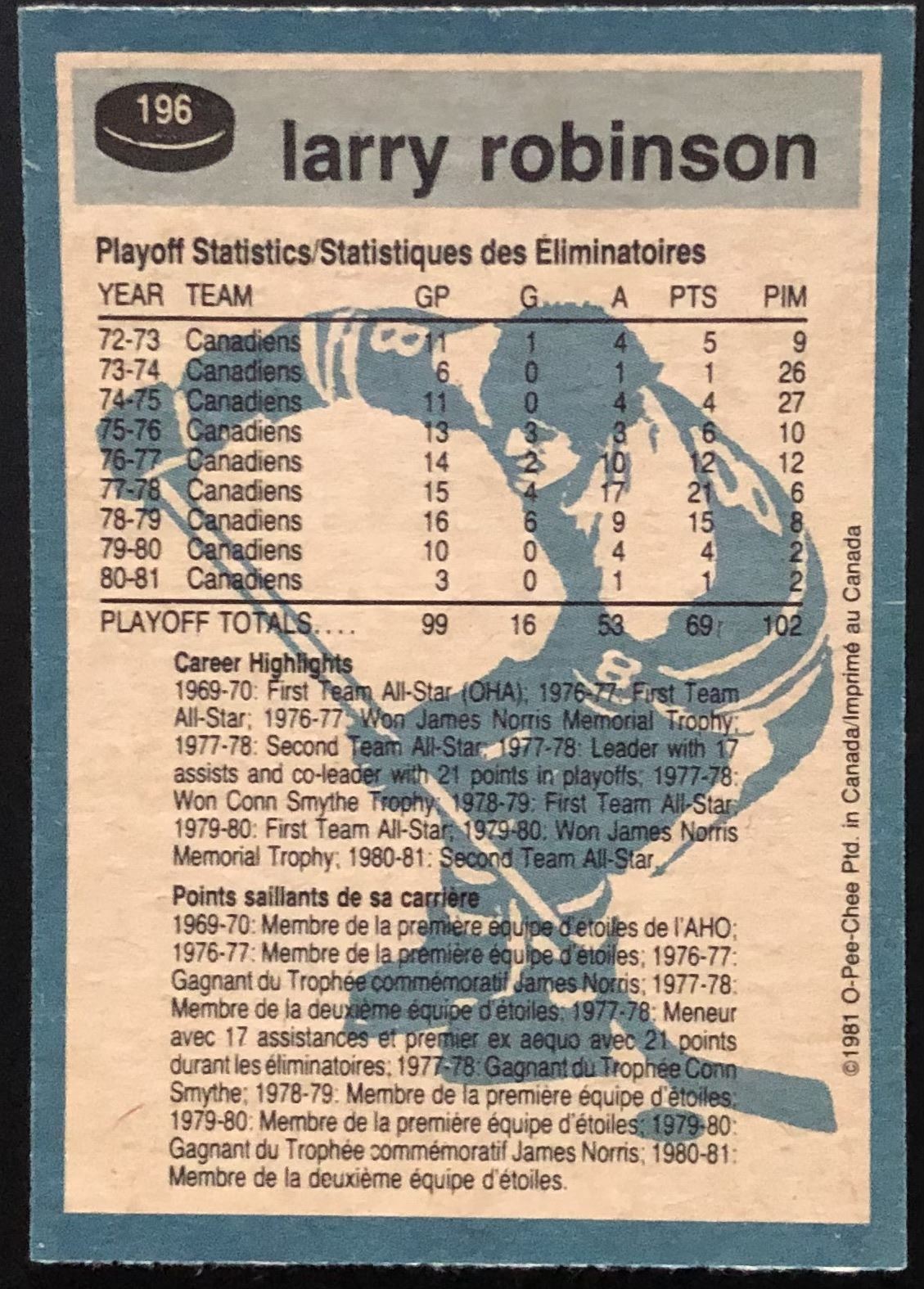 Card #196 NHL, hockey, vintage, OPC, hall of fame