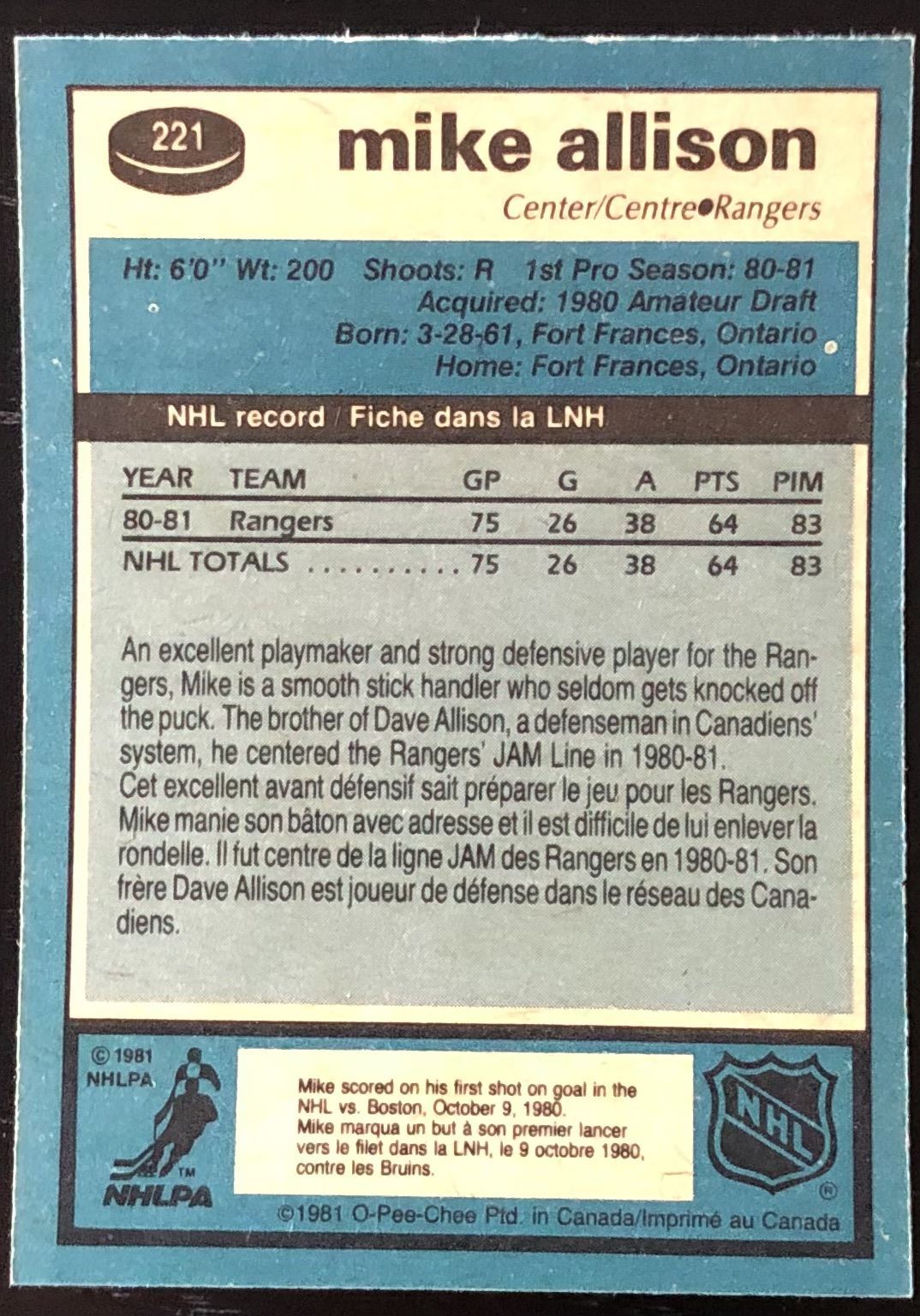 Card #221 NHL, hockey, OPC, vintage, rookie