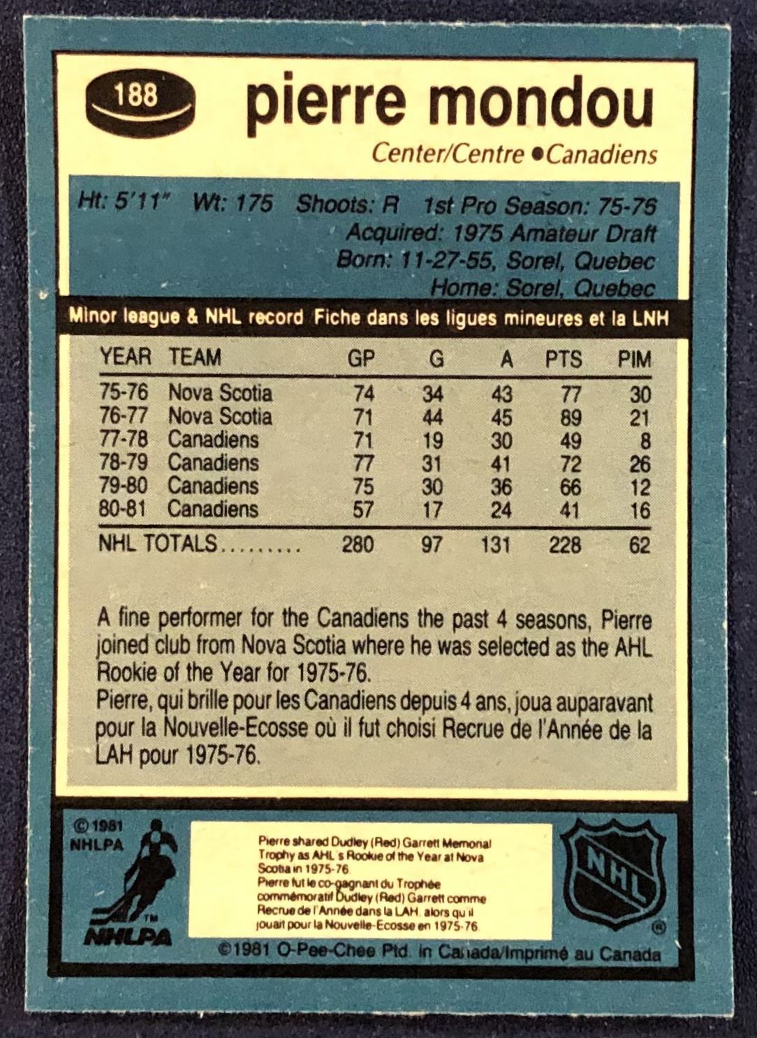 Card #188 NHL, hockey, OPC, vintage